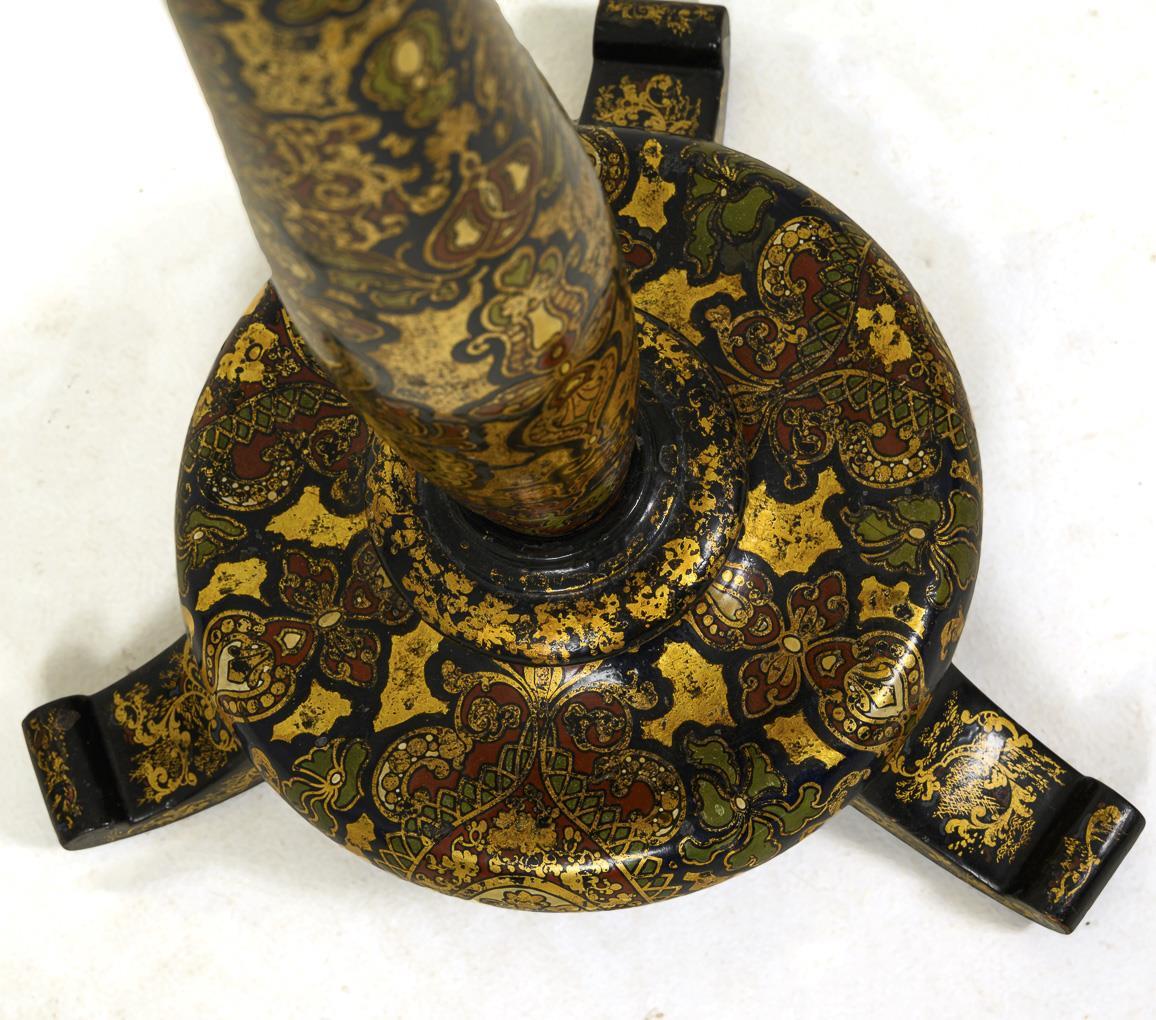 Richly decorated stove shade on column shaft with brass strut and height-adjustable, curved framed, round shade; painted in Asian style with gold elevation, shade with finely painted hunting scene. Traces of age/use, painting rubbed, crackled and with glue spots.