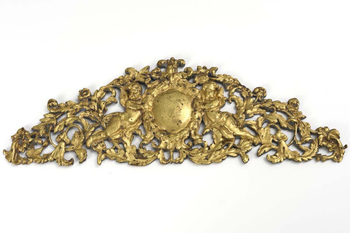 Tendril work crowning with putti holding an empty cartouche. Scuff marks on the edge and back.