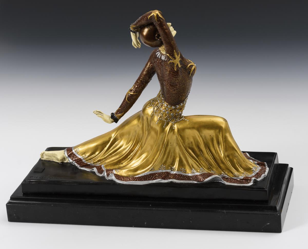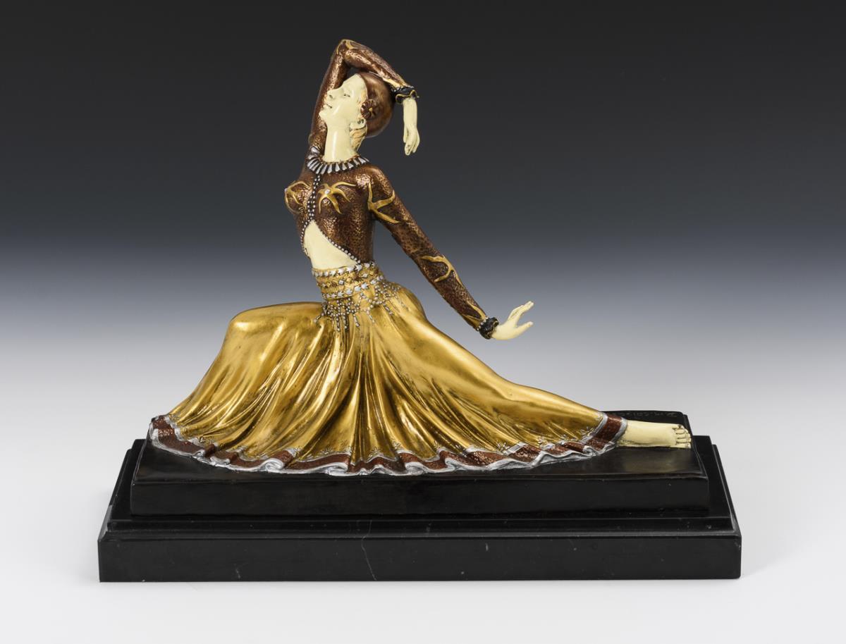 In wide lunge ecstatically depicted expression dancer in exotic dress. The frame imitates a chryselephantine figure. Minimal paint chips.