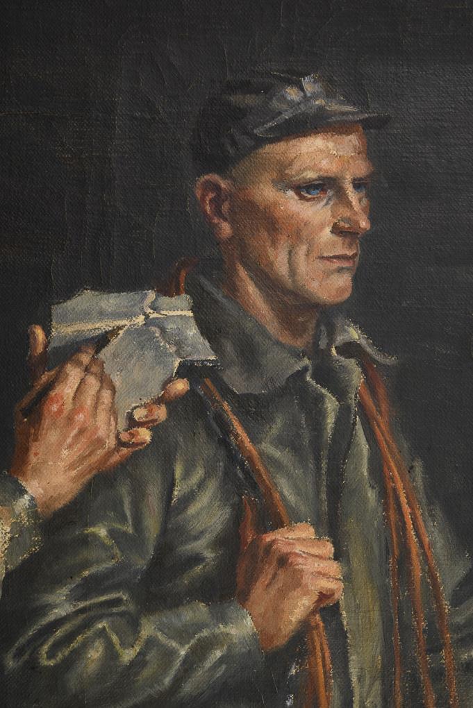 The miners in the gallery at a meeting in the lamplight. Paint chips.
