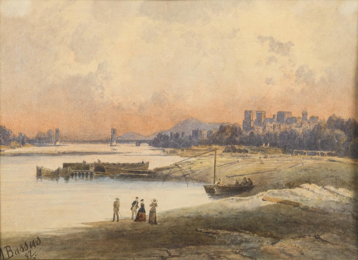 Probably English landscape with wide river and a large castle complex under slightly cloudy sky.