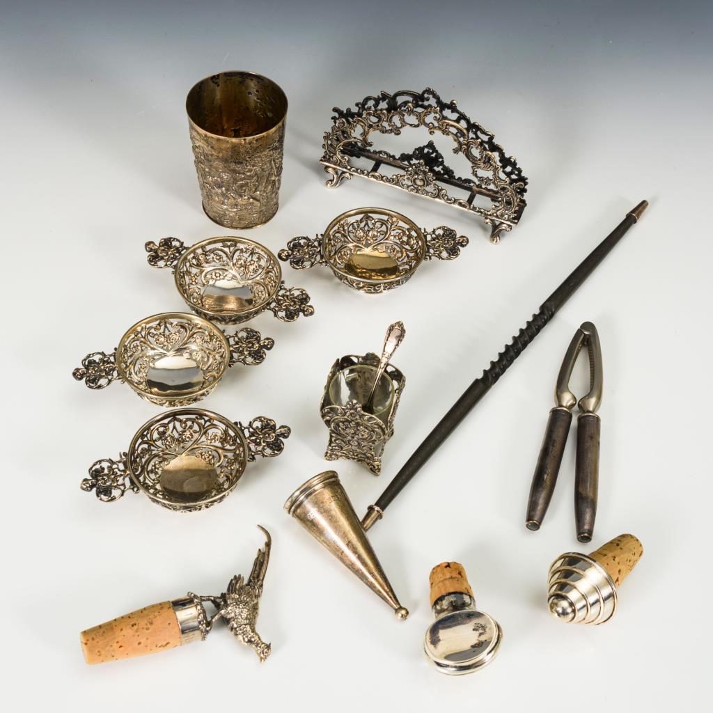 3 Flaschenkorken, 4 Durchbruchschälchen, 1 Gefäßhalterung (ohne Einsatz) mit Löffel, 1 Serviettenhalter, 1 Becher, 1 Nussknacker, 1 Kerzenlöscher. Teils leichte Altersspuren.