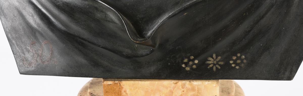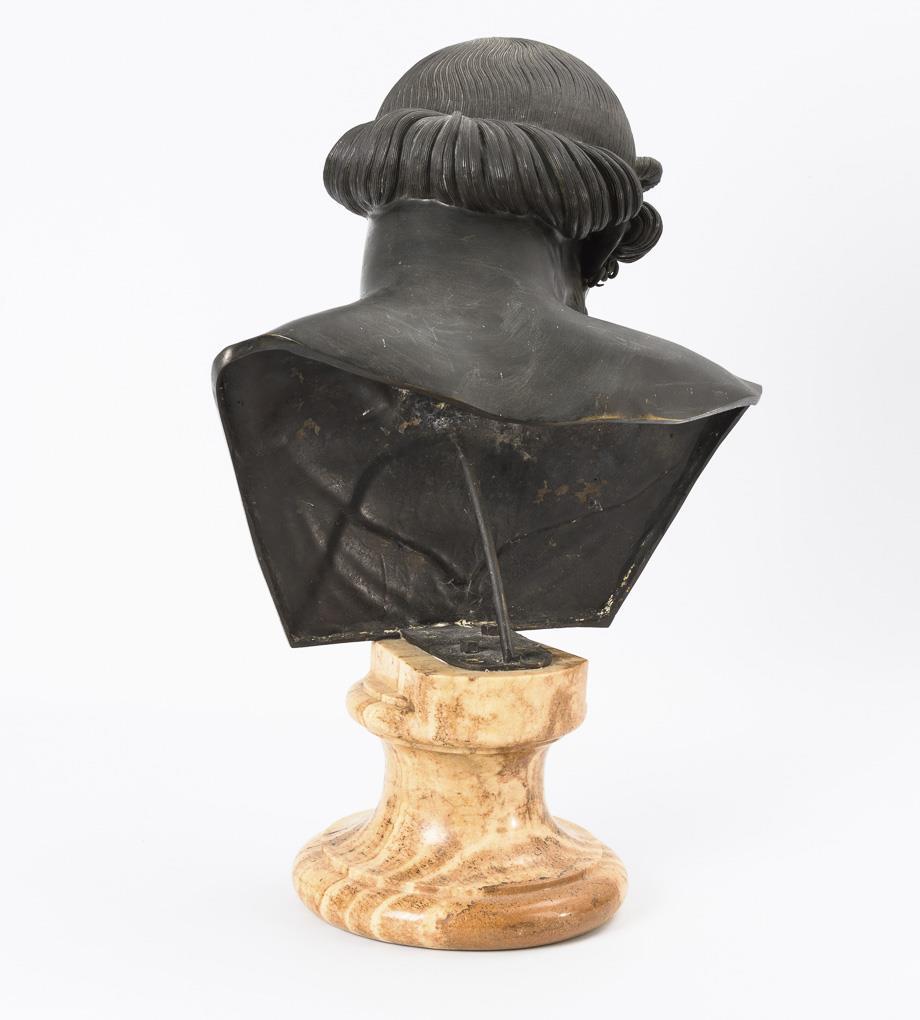 Bronze black patina, light yellow marble base. Circa 1900. unmarked, in the front on the robe red no. "50", and 3 painted floral rosettes, probably Fonderia Summer Napoli. H 47 / 69 cm. 33,2 kg.