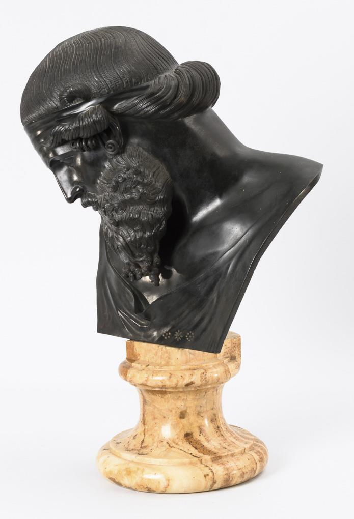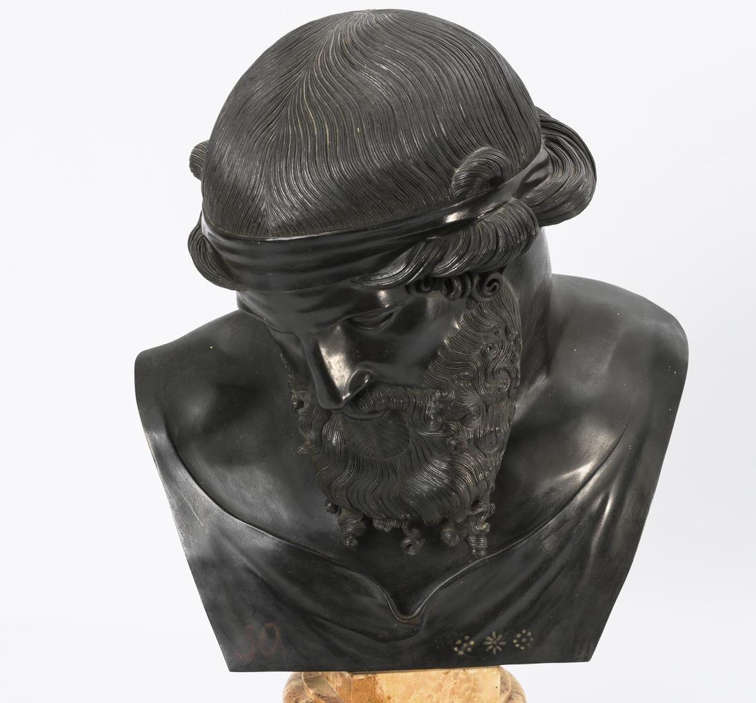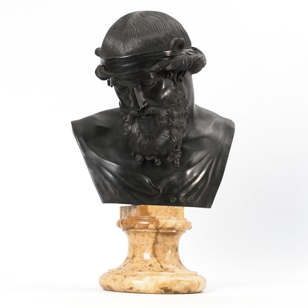 Slightly larger than life, very finely chiseled bust of the god of wine with bandage in carefully coiffed hair. The antique original was found in Villa dei Papiri and is in the National Archaeological Museum of Naples. Minimal signs of age/use.