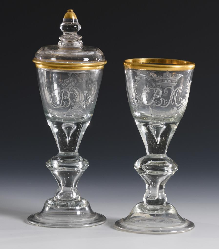 Tapered cup with pierced bubble in solid base, baluster stem with large pierced bubble, hat-shaped foot with everted rim; demolition; 1x with original pommel lid. On the front of each a finely engraved coat of arms (1x with a fox and 1x with horizontally divided escutcheon), verso each a crowned monogram ("LvB" and "BvM"), gold rim.