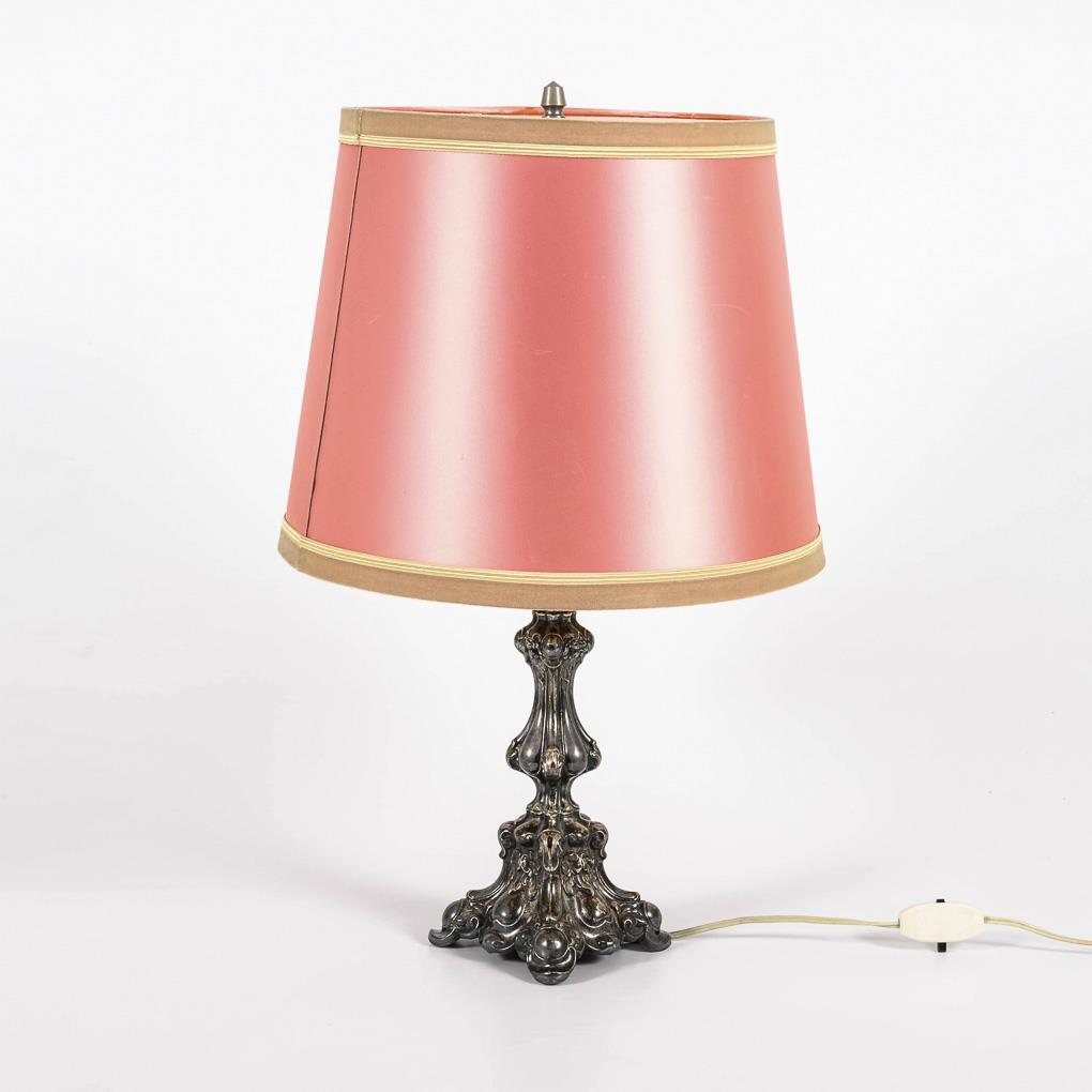 Rich relief old candlestick, repurposed as a table lamp with old pink lampshade. Marks of age, small dents, function not tested.