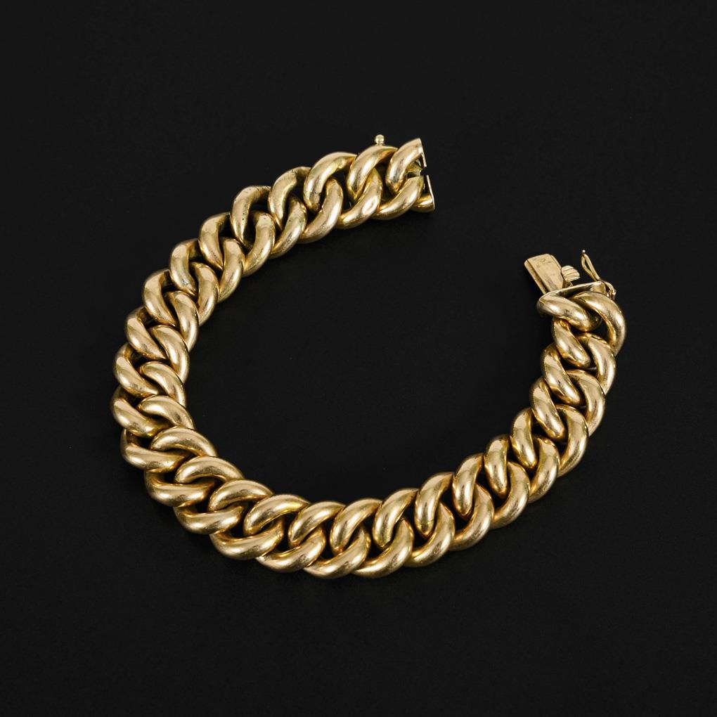 Tested yellow gold 585. Hallmarks uninterpreted. 21.5 x 1.5 cm. 47,2 g.