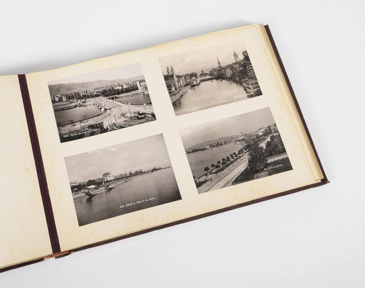 Mostly professional photos from Switzerland, Munich, Suez Canal, London, Innsbruck and Antwerp (Anvers). Private compilation. Wine red album with gilt edges.