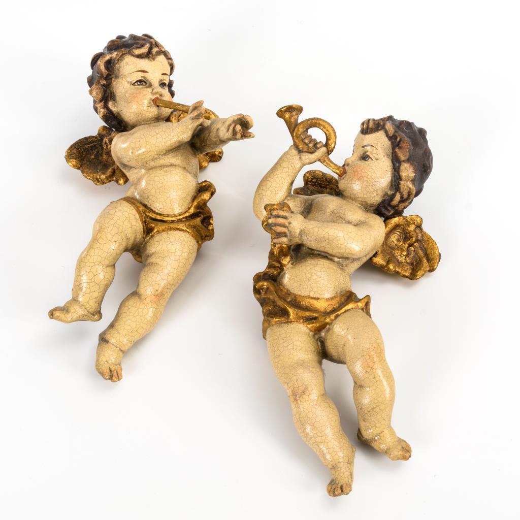 Einander zugewandte Engel mit Posaune bzw. Horn. Vorderteil der Posaune fehlt, krakeliert, geringe Alters-/Gebrauchsspuren.