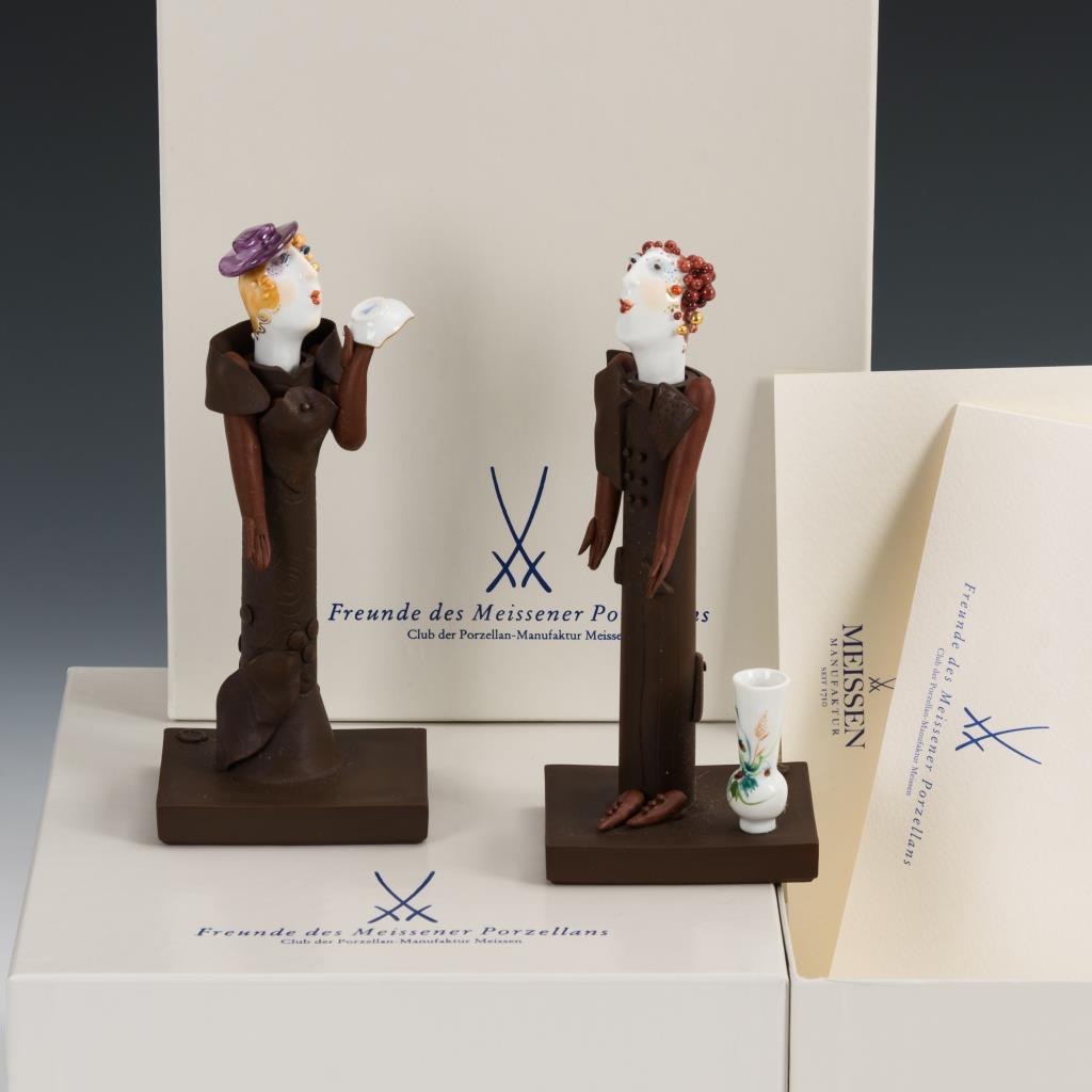 Figur einer Sammlerin mit Porzellanschale sowie Figur eines Herren als Sammler, an einer Vase stehend. Linke Daumenspitze des Herren minimal bestoßen.