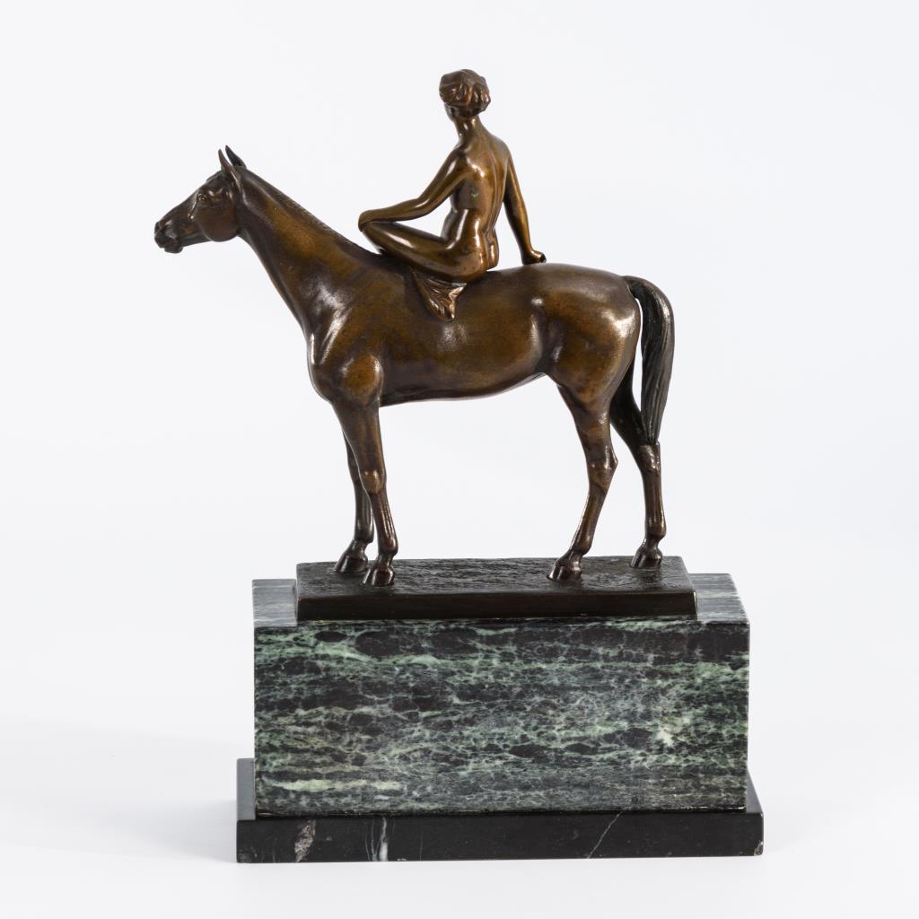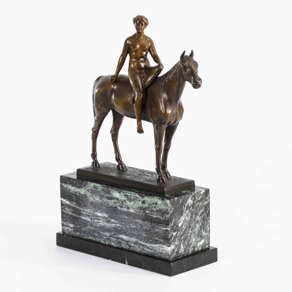 Auf stehendem Pferd sitzender Akt einer jungen Frau. Speer fehlt, kaum Alters-/Gebrauchsspuren.