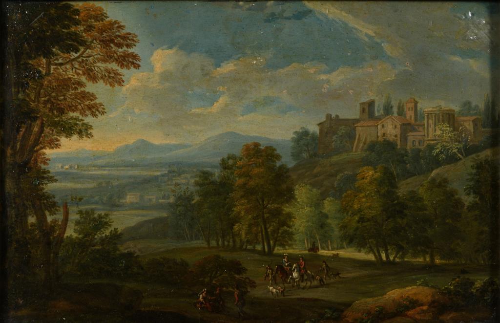 Die Gesellschaft zu Pferd mit Jagdhunden in der hügeligen Landschaft nahe der Burg. Altersspuren.
