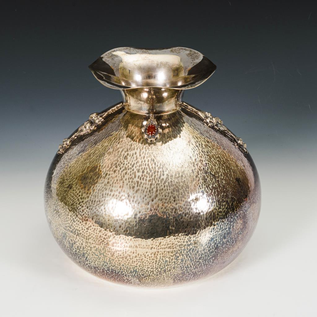 Große Vase mit floraler Reliefauflage und 2 ovalen Karneolcabochons. Unterseitige Gravur K. 1 Delle am Stand, Korpus minimal gedellt.