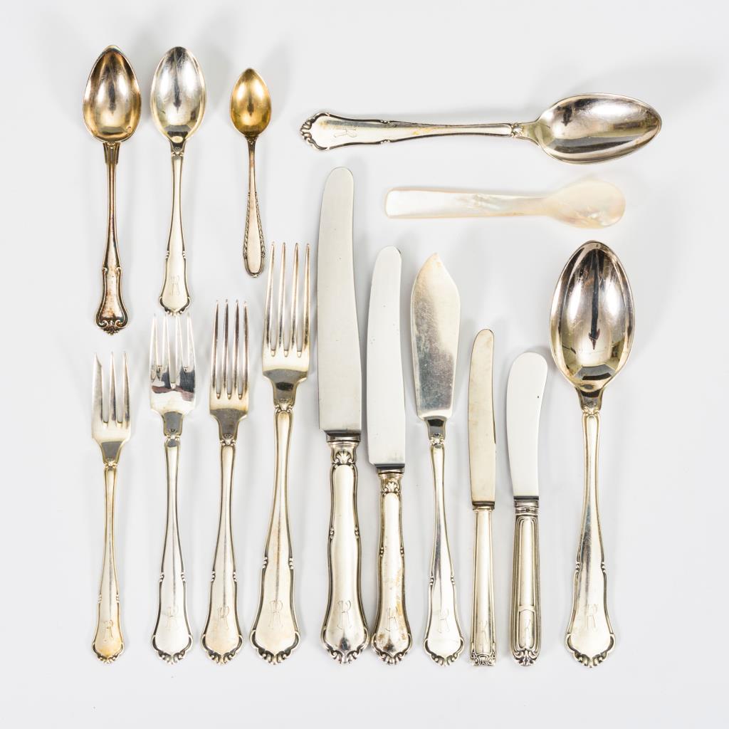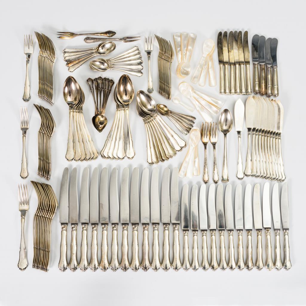 Art-déco-Besteck mit kleinem Fächerrelief am Griffende und Monogrammgravur "K". 12 Speisegabeln, 12 Speisemesser, 12 Suppenlöffel, 10 Dessertgabeln, 12 Dessertmesser, 8 Dessertlöffel, 11 Kaffeelöffel, 12 Kuchengabeln, 12 Fischmesser und 12 Fischgabeln. Dazu verschiedene Besteckteile mit abweichendem Dekor: 6 Mokkalöffel, 6 Obstmesser, 6 Kaffeelöffel, 3 Kuchengabeln, 1 Dessertlöffel, 1 Fleischgabel sowie 12 + 1 Perlmuttlöffelchen. Gebrauchsspuren.