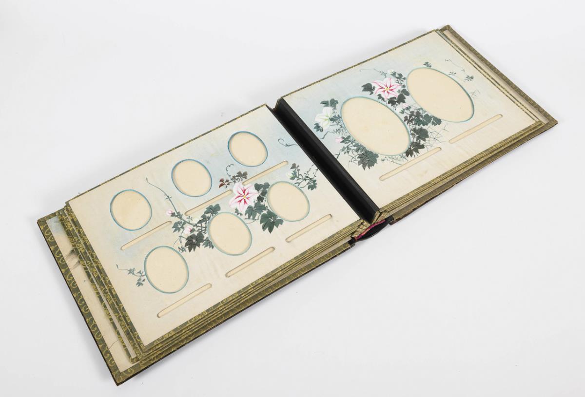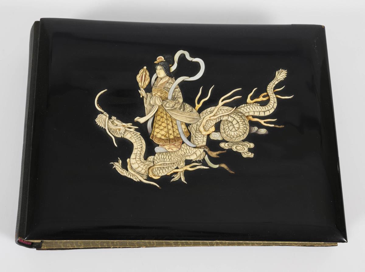 Photo album with oval and rectangular cutouts for photos. Pages hand-painted with various motifs on silk. Black lacquer cover with relief inlay of bone and mother of pearl (standing woman on dragon).