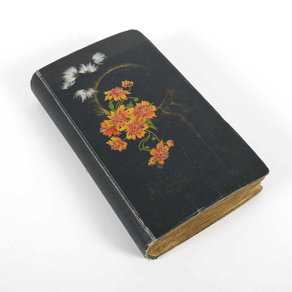Kitsch and greeting cards, partly embossed, around 1920, in blue "Postcards Album" with flowers.