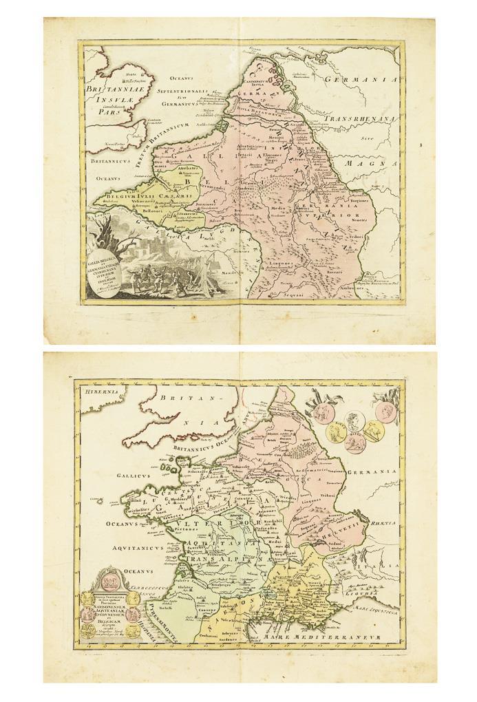 2 detailed historical maps of the territories "Gallia Belgica" and "Gallia Transalpina", each with decorative title cartouches, verso with note in ink "Gera d. April 6 Robert Lanzendorf" and "1799". Each with centerfold, each foxed and soiled.