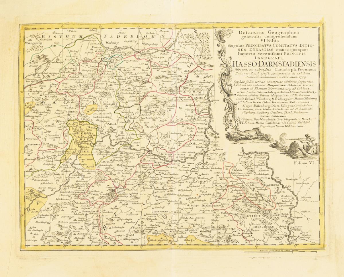 Detailed historical map of the Landgraviate of Hesse-Darmstadt, title cartouche with hunting scene and detailed legend "Delineatio Geographica generalis comprehendens VI. Folis [...] Landgrafii Hasso-Darmstadiensis [...], drawn by Christoph Pronner. Buck crease, some foxing, light browned and soiled.