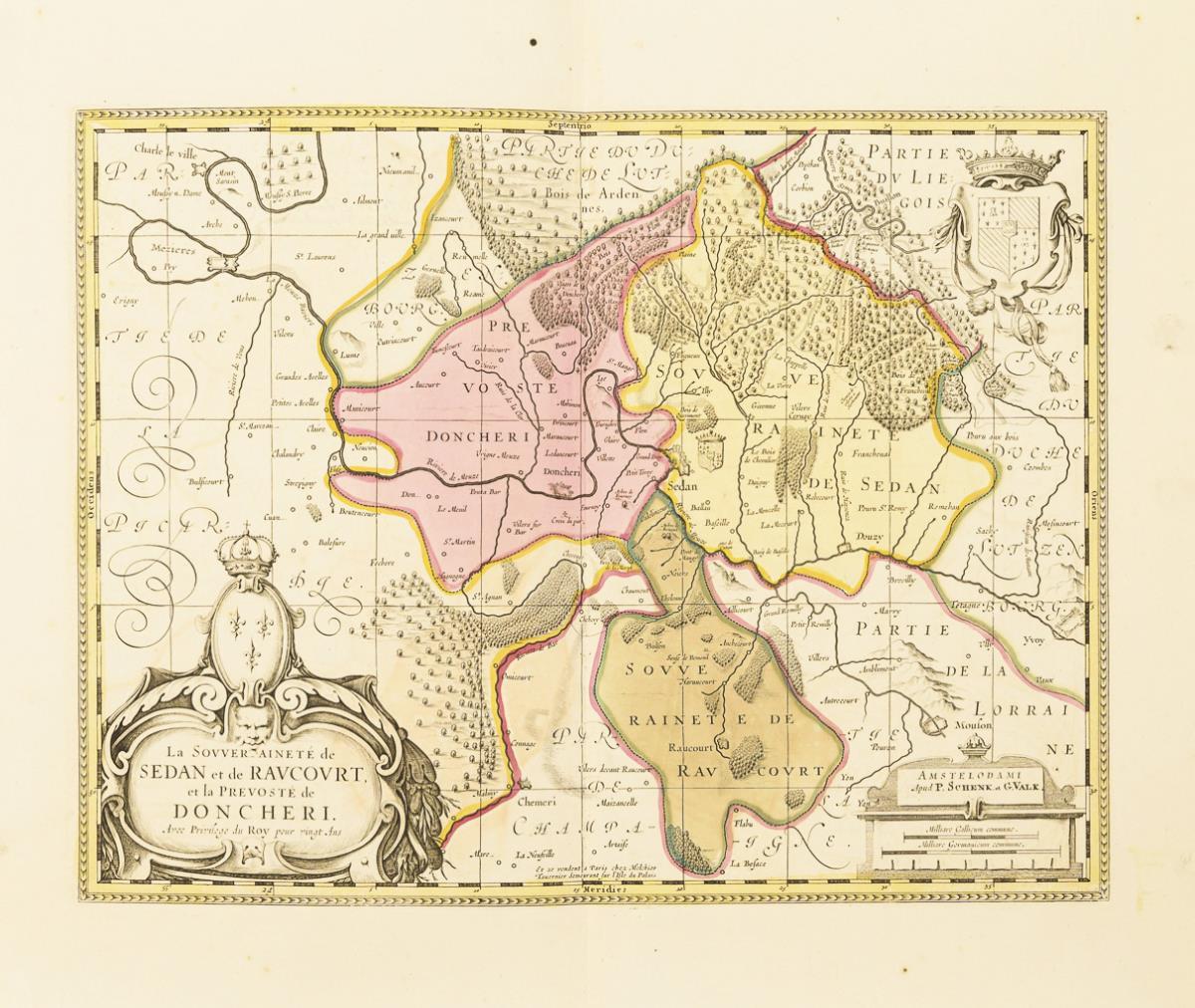 Detailed historical map of the French principality of Sedan and Raucourt, with title cartouche "La Souveraineté de Sedan et de Raucourt et la Prevosté de Doncheri [...]", supplementary cartouche with mileage markers, verso with ink inscription in French. Buck crease, some foxing.