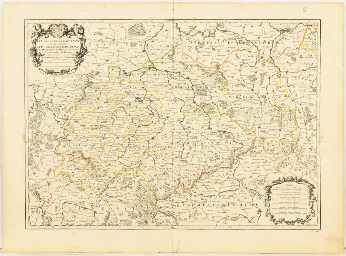Detailed historical map of the Upper Saxon Imperial District, with figural title cartouche "Le Cercle de Haute Saxe ou sont compris Le Duché et Esclectorat de Saxe [...]", accompanying cartouche with mileage pointers. Buckle, sheet grip and crease, marginal area partly cracked, some foxing.