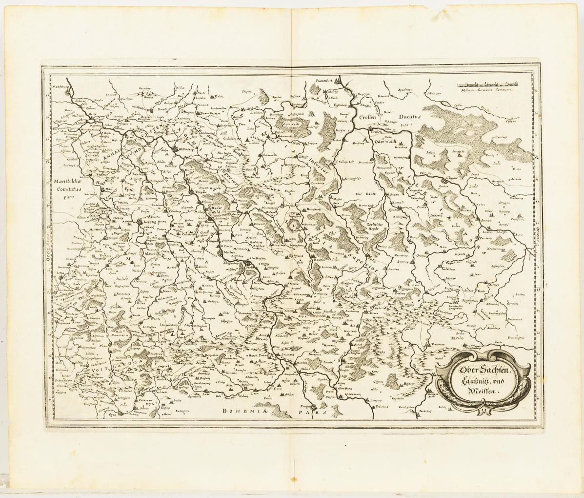 Detailed historical map of the area around Laußnitz and Meissen, title cartouche "OberSachsen. Laußnitz and Meissen", mileage pointer. Buck crease, leaf margin light browned.