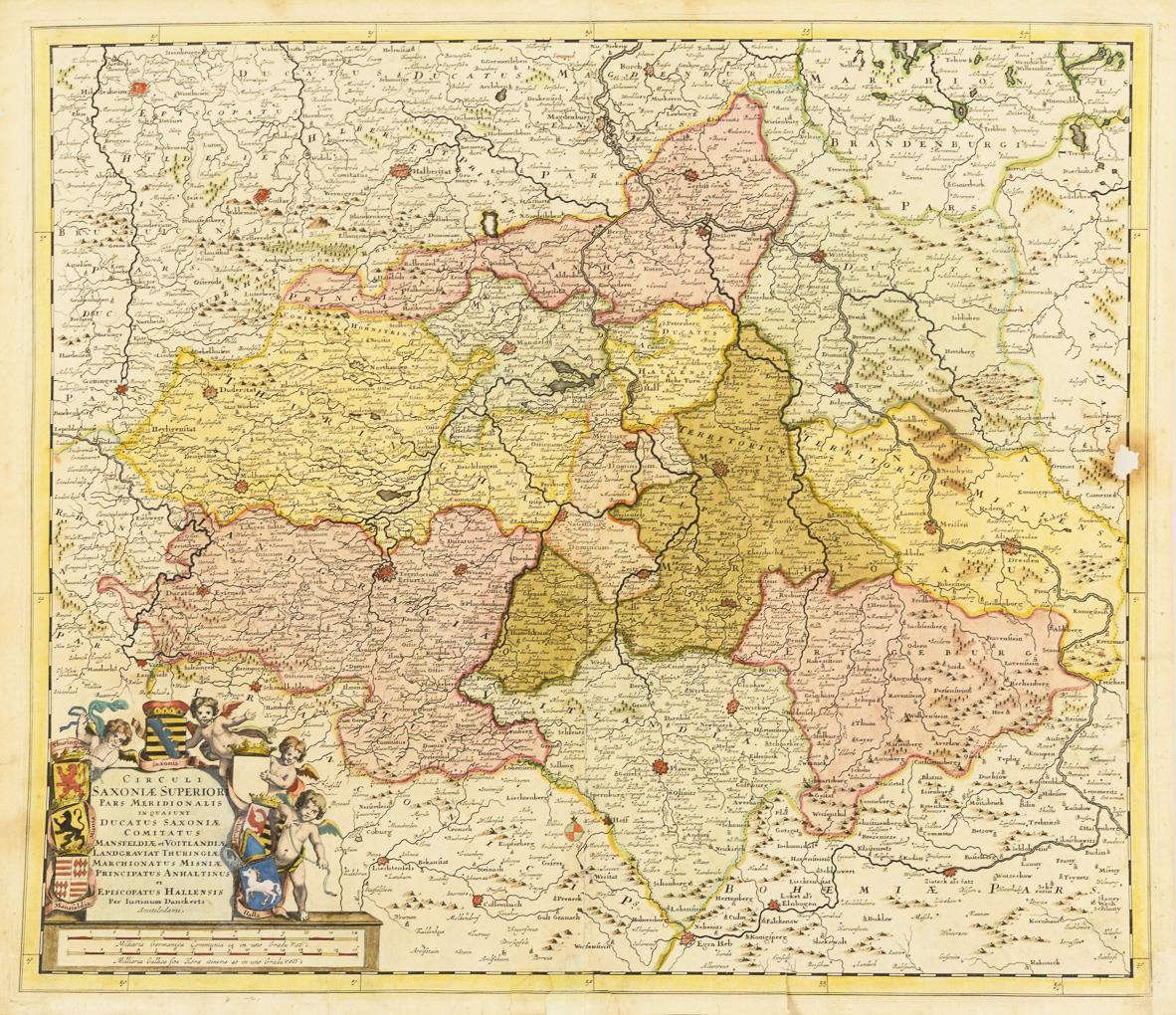 Detailed historical map of the Upper Saxon Imperial District and surroundings, figural title cartouche with coats of arms of Mansfeld, Meissen, Saxony, Thuringia, Halle and Anhalt "Circulus Saxoniae Superiroris pars meridionalis in qua sunt ducatus Saxoniae [....]". Buck crease, sheet light browned and foxing, small retouching, tear at lower margin.