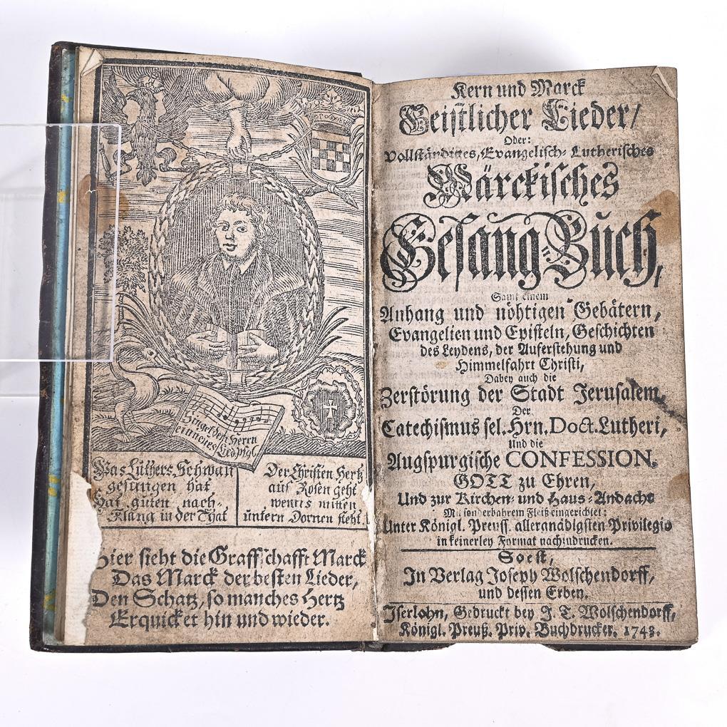 "Kern und Mark geistlicher Lieder. Or: Complete, Evangelical Lutheran Märckisches Gesang-Buch, samt ein Anhang und nöthigen Gebätern(sic), Evangelien und Episteln, Geschichte des Leidens, der Auferstehung und Himmelfahrt Christi. There is also the destruction of the city of Jerusalem, the Catechism of Doct. Lutheri, and the Augspurgische Confession".