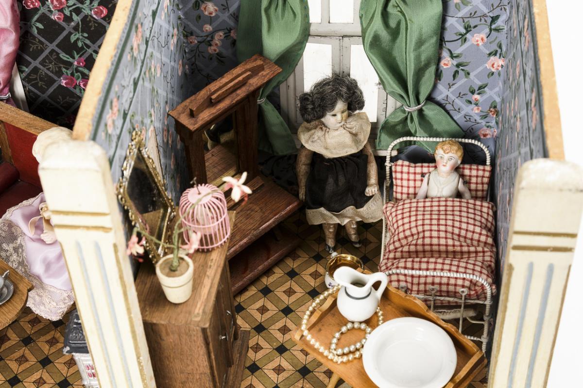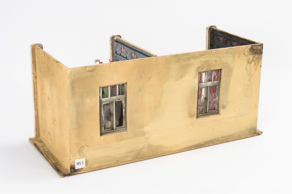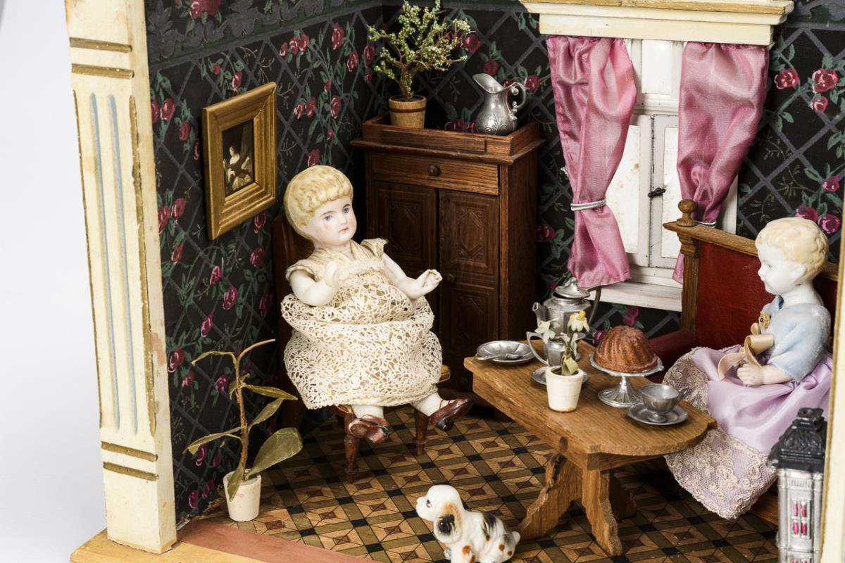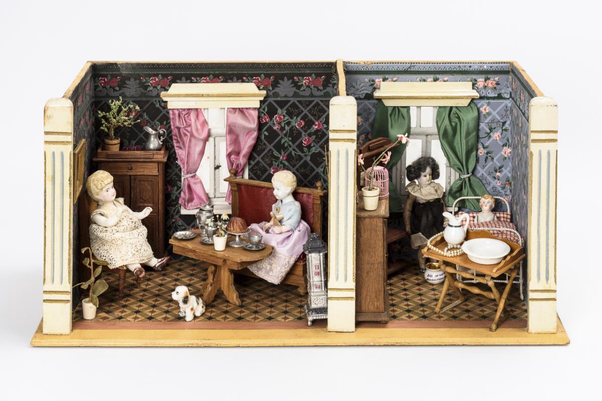 2-room case with front pilasters, 2 windows, intermediate door and curtains. Furnished as a living room and bedroom with Wilhelminian oak furniture, tin stove, folding table, white wire bed, etc. In addition 4 dolls and 1 dog. Played, traces of age, supplemented window panes of plastic.