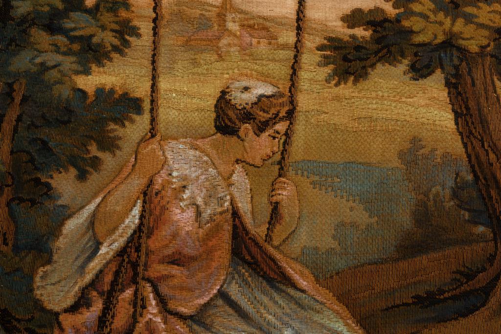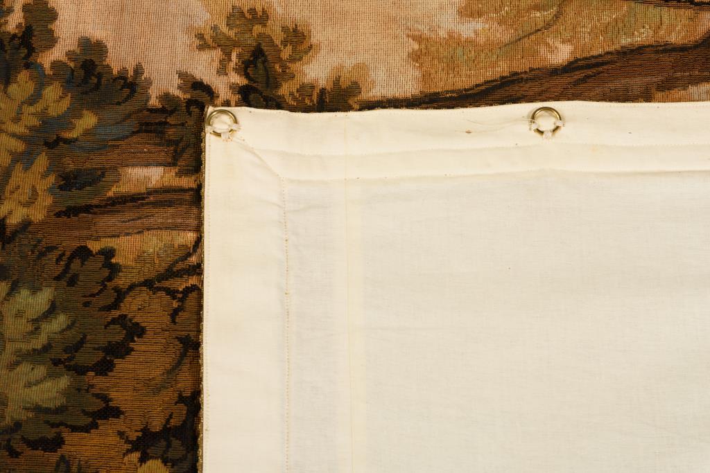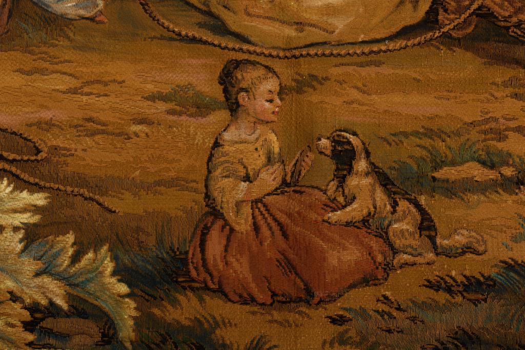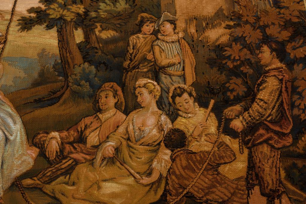 Wandbehang mit barocker Mehrfigurenszene beim Zeitvertreib in idyllischer Landschaft, wohl beschnittene Bordüre, ergänzte Goldborte, verso Ringaufhängung. Alters- und Gebrauchsspuren, Defekte.
