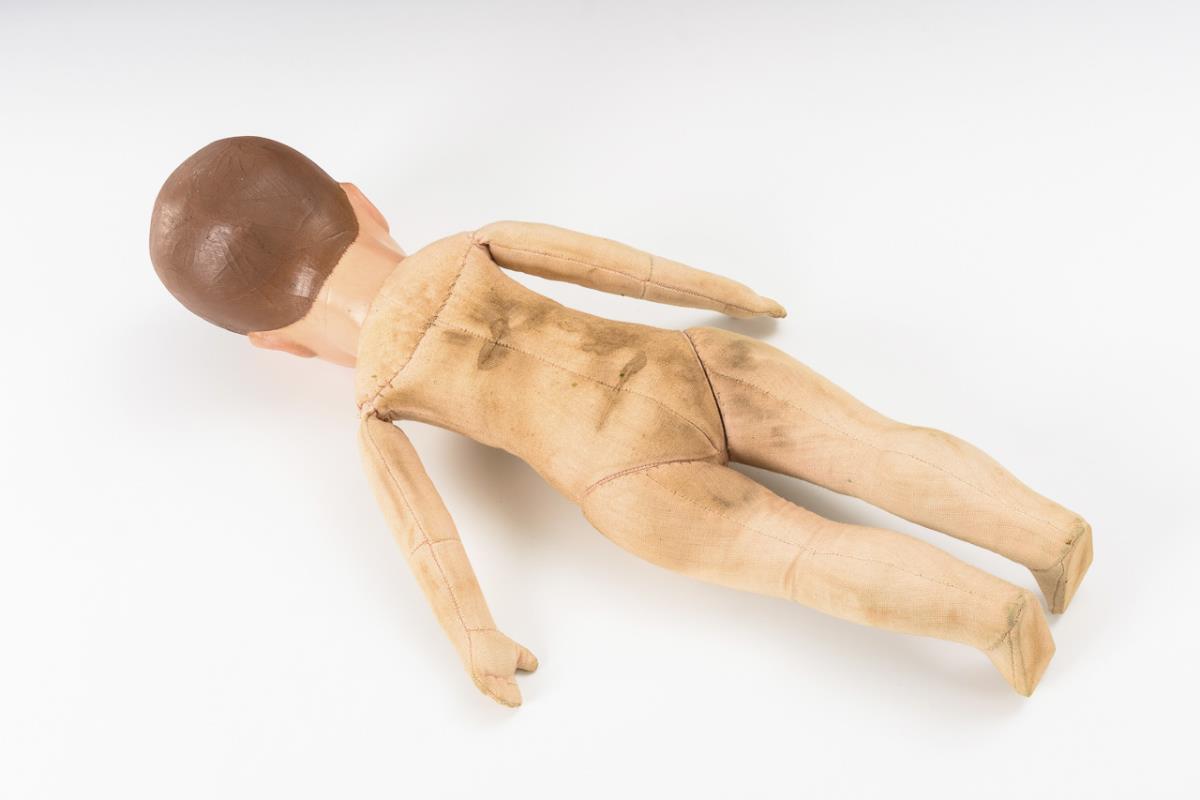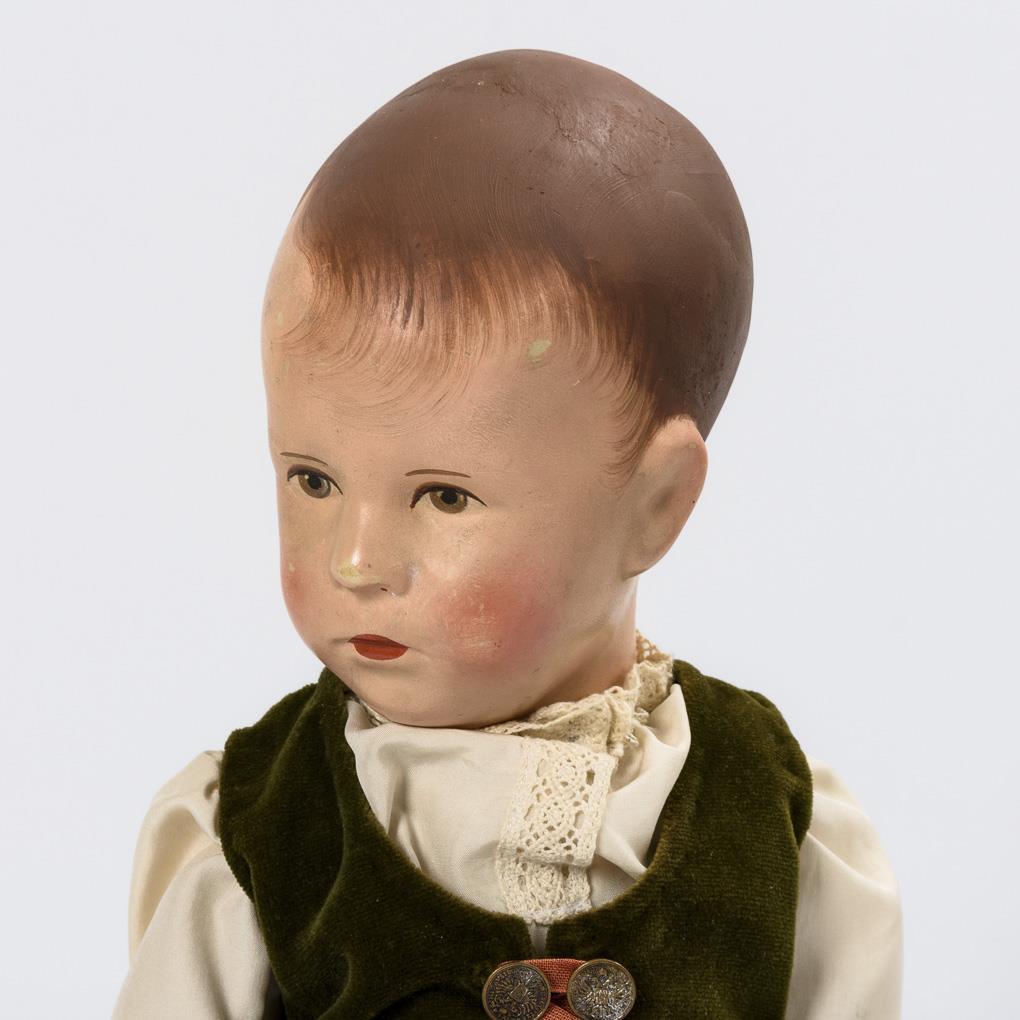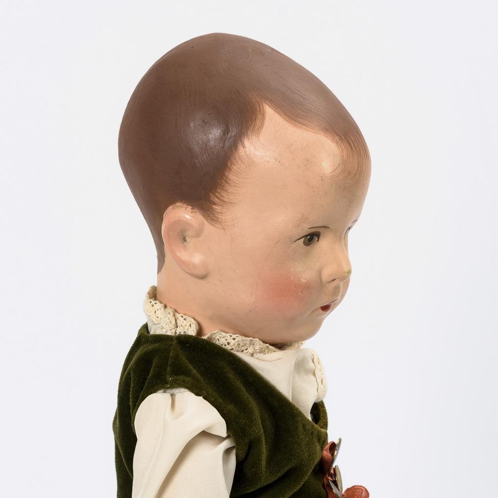 Painted head with brown hair. Body made of coarse fabric. Green velvet dress, white apron, white shoes. Back of the head crackled and partially retouched. Body dirty.