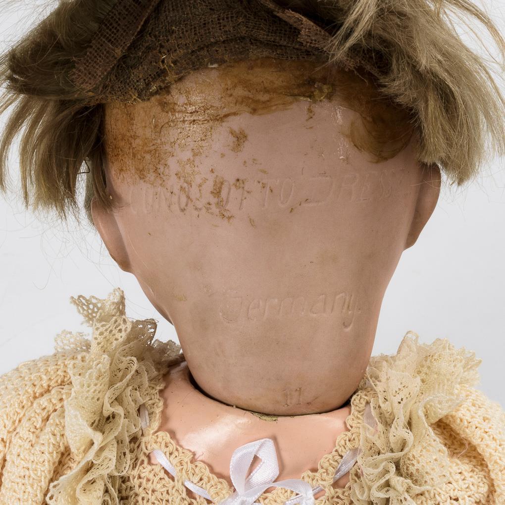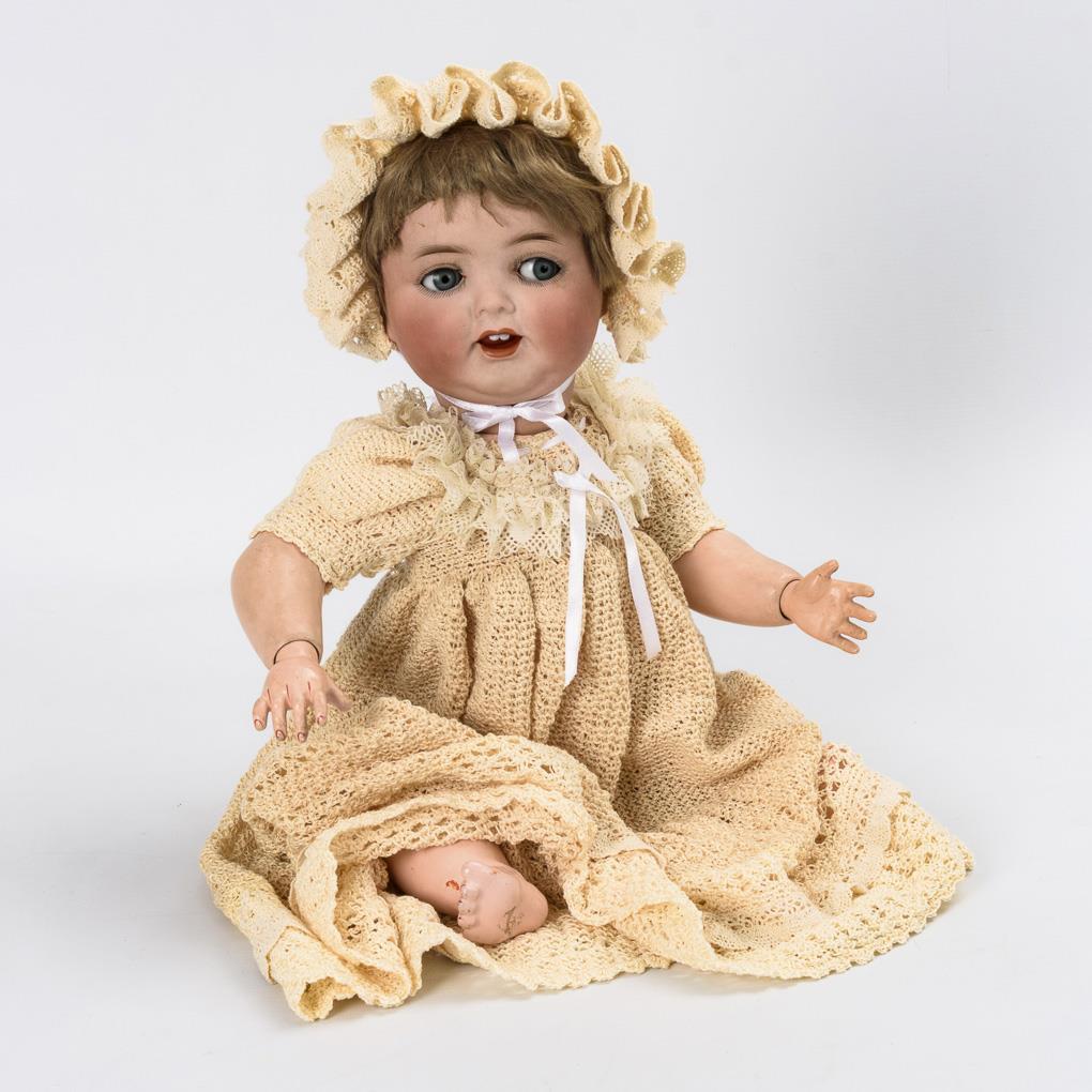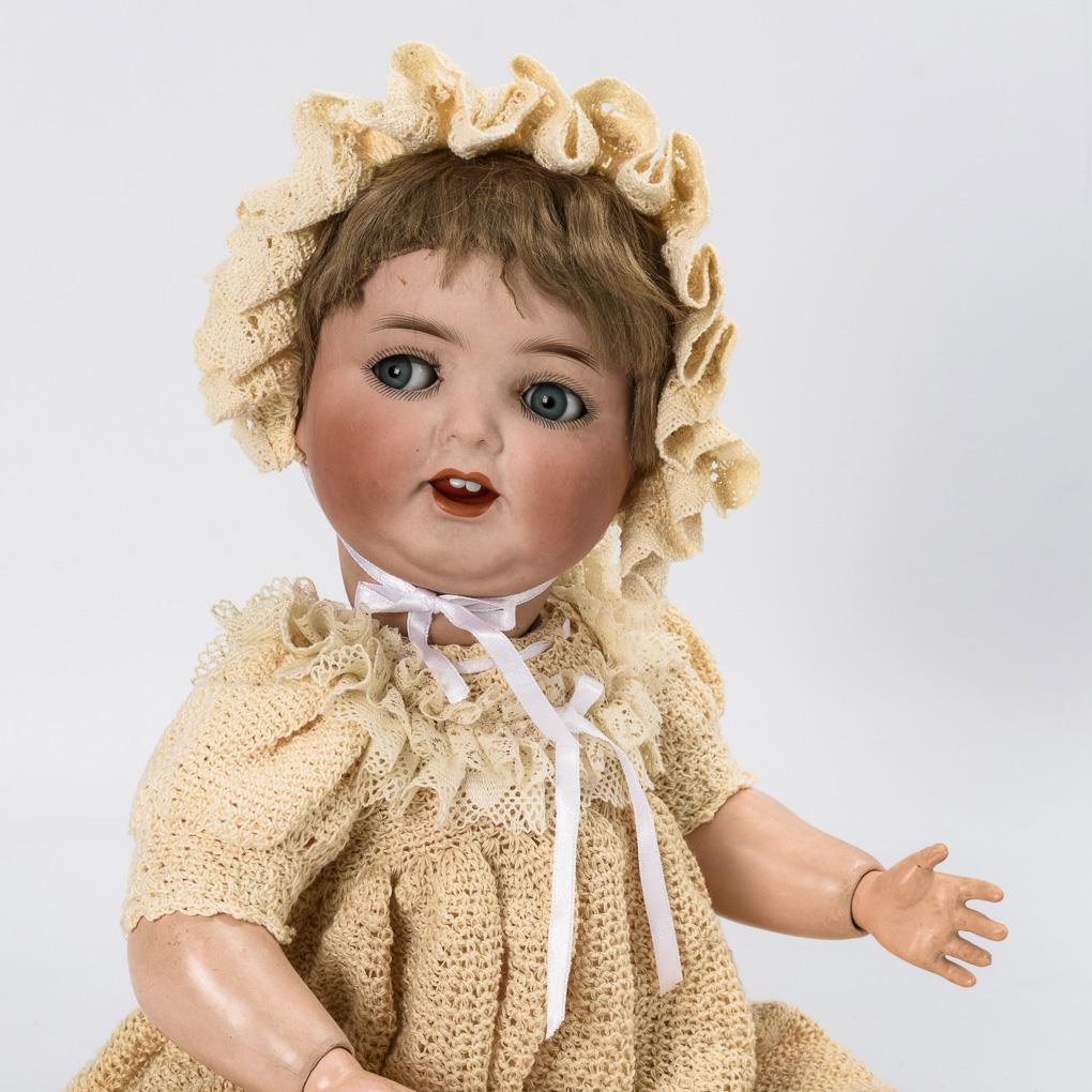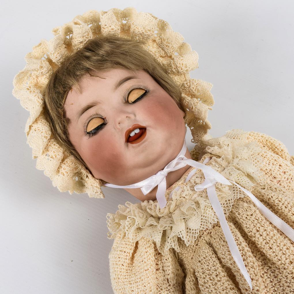 Crank head, blue sleep/sleep eyes, eyelashes, blond mohair wig. 7-piece sitting baby body with moving hands. Cream crochet dress and matching hat. Hairline crack in the back of the head.