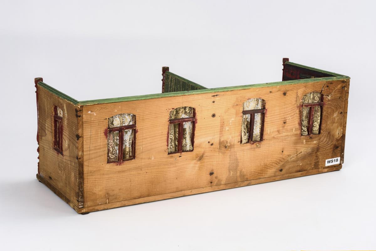 Two-room case with 6 unglazed windows, curtains, open passage and turned columns at the front. Parlor with stove and cardboard Christmas tree, bedroom furnished with double bed and desk. In addition, various accessories and 4 dolls. Played, signs of age and defects.