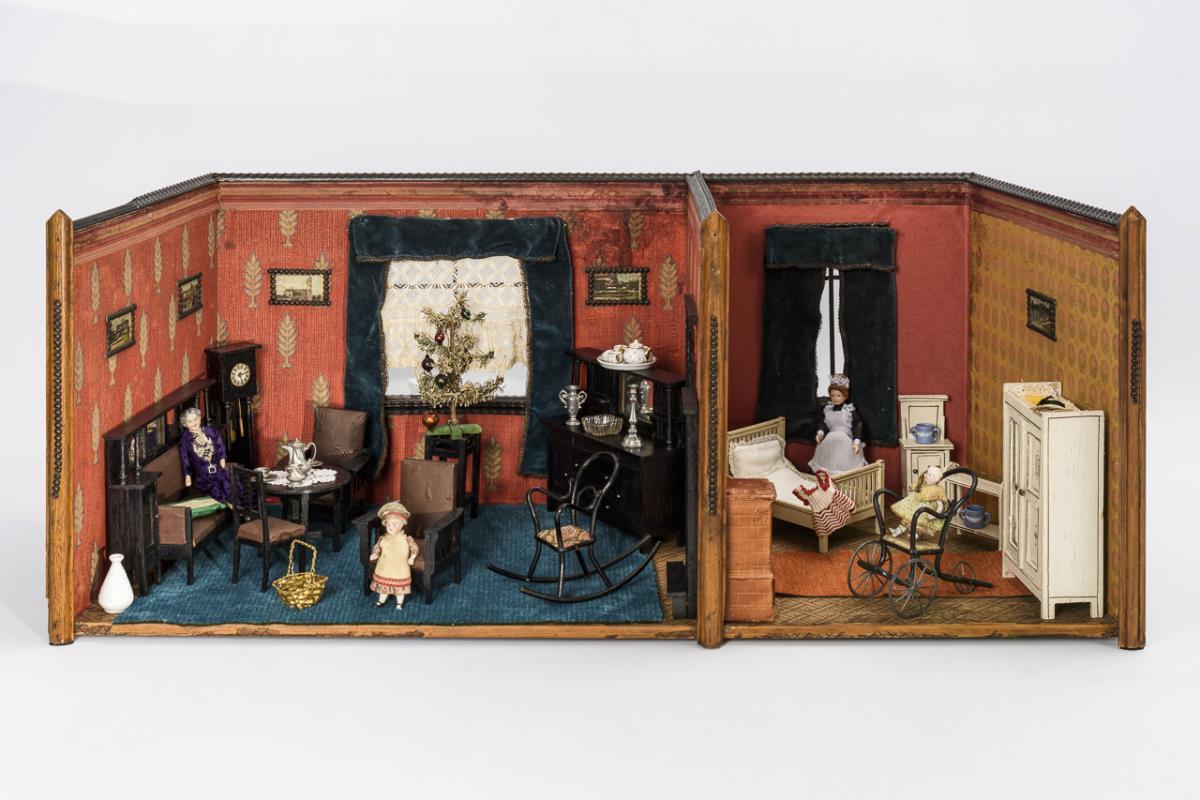 Trapezoidal two-room case with 2 glazed windows, curtains and open passage. Furnished as a salon with dark brown Art Nouveau furniture and Christmas tree, and as a children's room with white bedroom furniture. In addition 4 dolls. Traces of age, water damage to the wallpaper, 1 wall repapered, 1 mirror with crack.