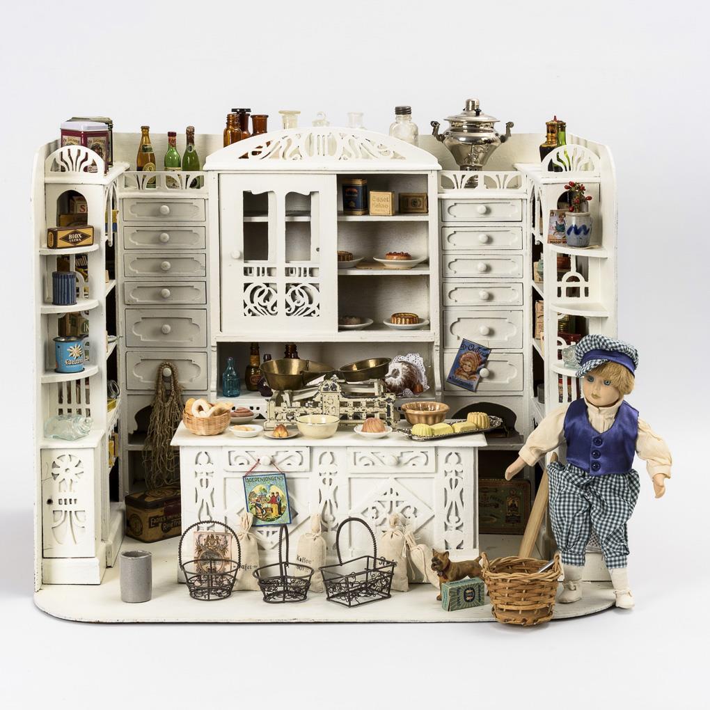 Decorative 1-room case with fixed store fitting, 12 drawers and unglazed sliding door. Matching, loosely set counter, scales, accessories, show dishes, dog and new doll as a seller. Played with, probably painted over.