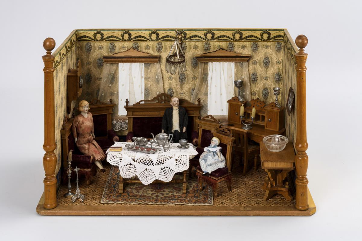 1-room case with front columns, 2 unglazed windows and curtains. Furnishings include desk, burgundy upholstered sofa, 2 matching armchairs, 2 chairs and chandelier. In addition, 3 old dolls. Slight signs of age.