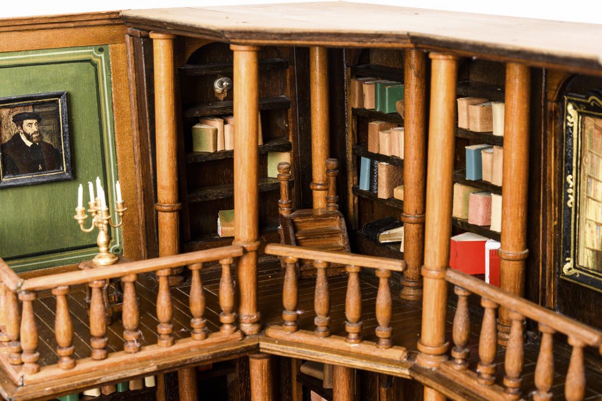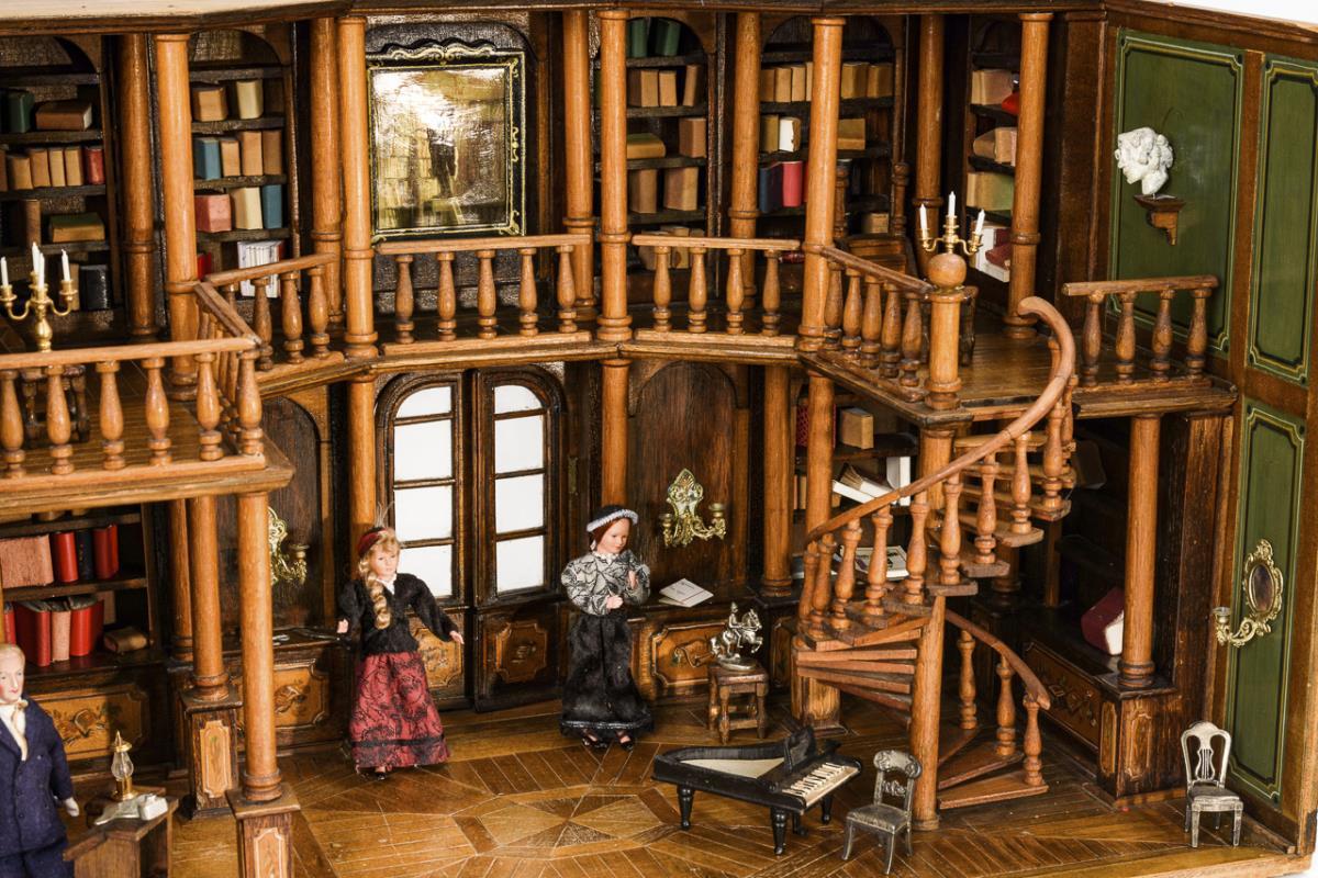 Richly furnished library on 2 floors, designed with attention to detail. With columned hall, spiral staircase, glazed double door, grand piano, indirect lighting and 3 dolls (1x old, 2x younger bending dolls). Wiring removed.
