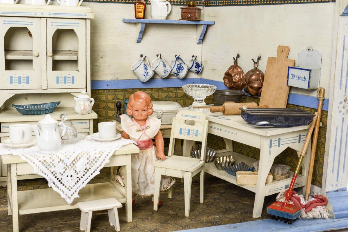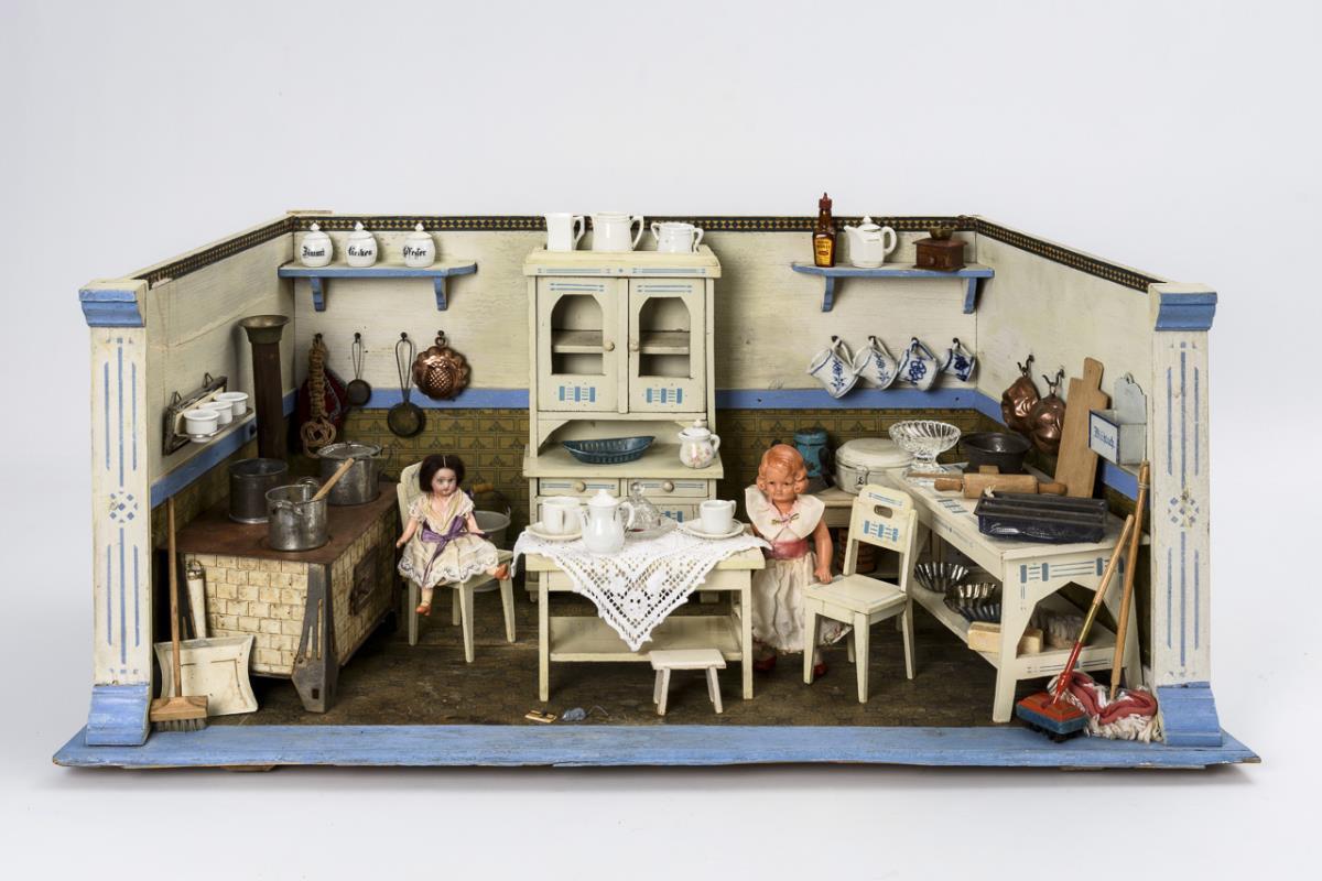 Trapezoidal cabinet with old floor paper in tile look. Furnished with kitchen buffet, sideboard and tin stove and porcelain, tin and copper tableware. In addition 2 dolls. Played, traces of age. Partly probably a little repainted.