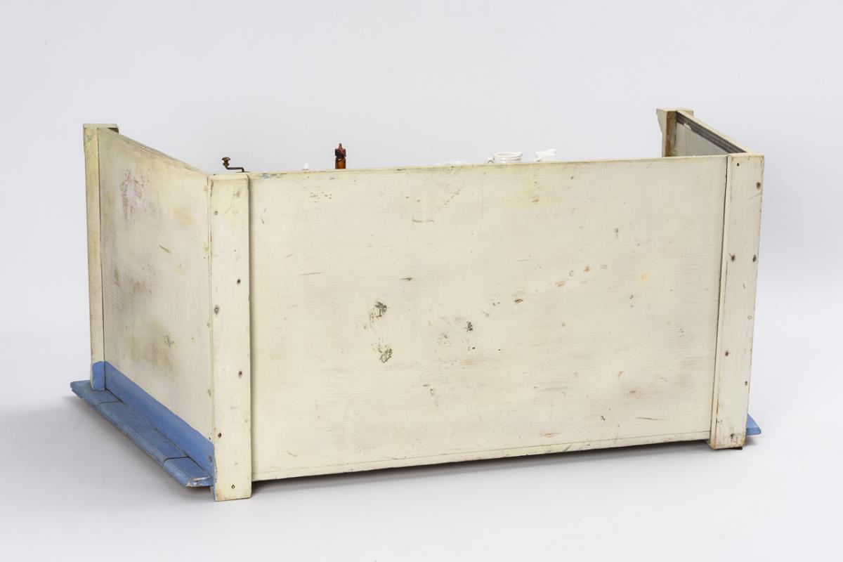 Wood, painted blue and white and old wallpapered. 36 x 87 x 41 cm.