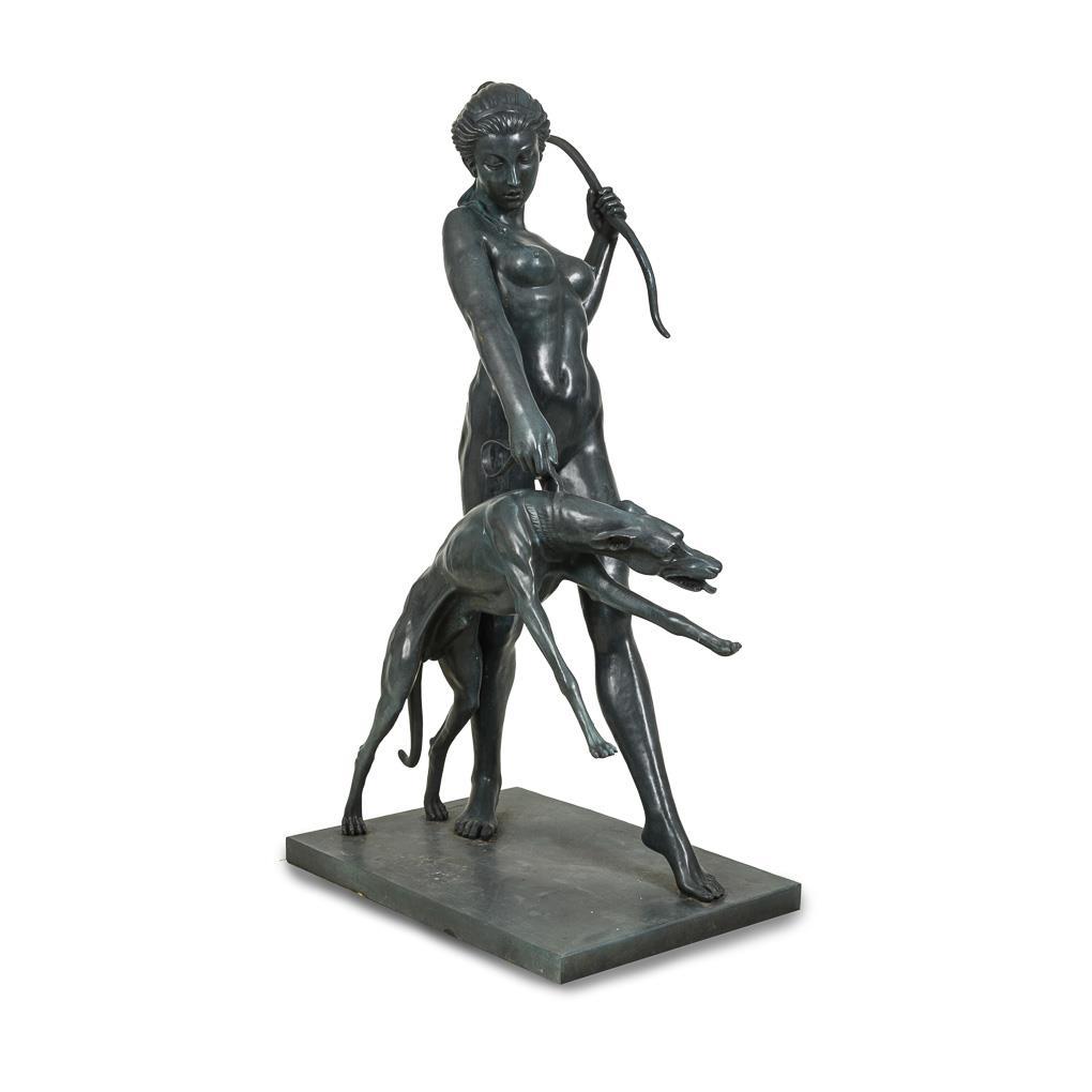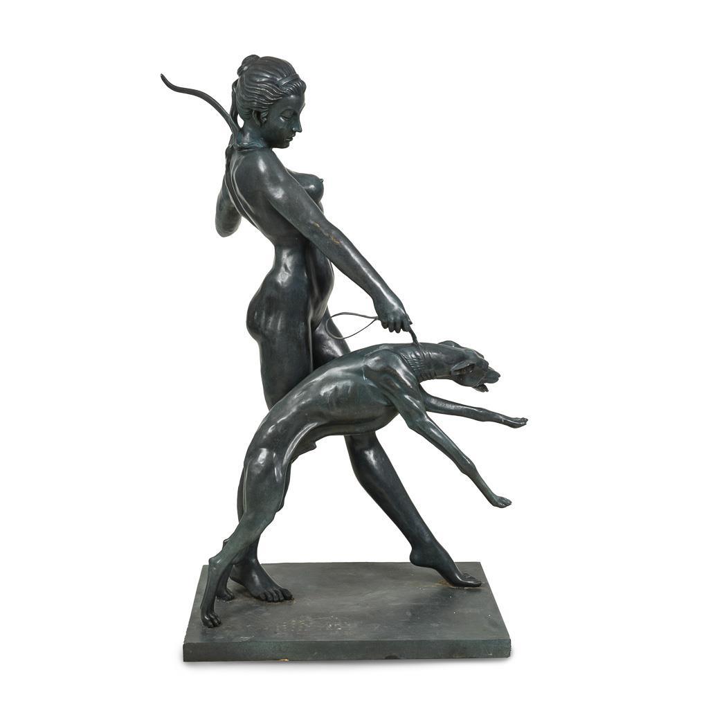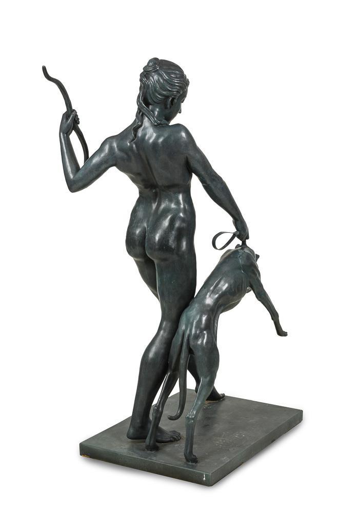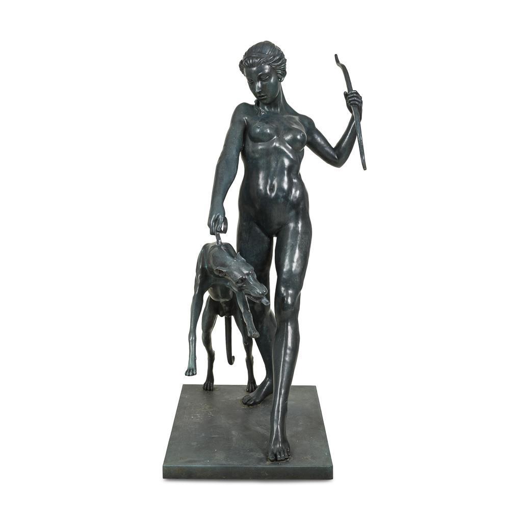 Almost life-size nude figure of the wide striding goddess, who holds her bow in a distinctive gesture, while the greyhound rushes forward on a leash. Modern casting after the 1923 original, which is now in the Metropolitan Museum New York.