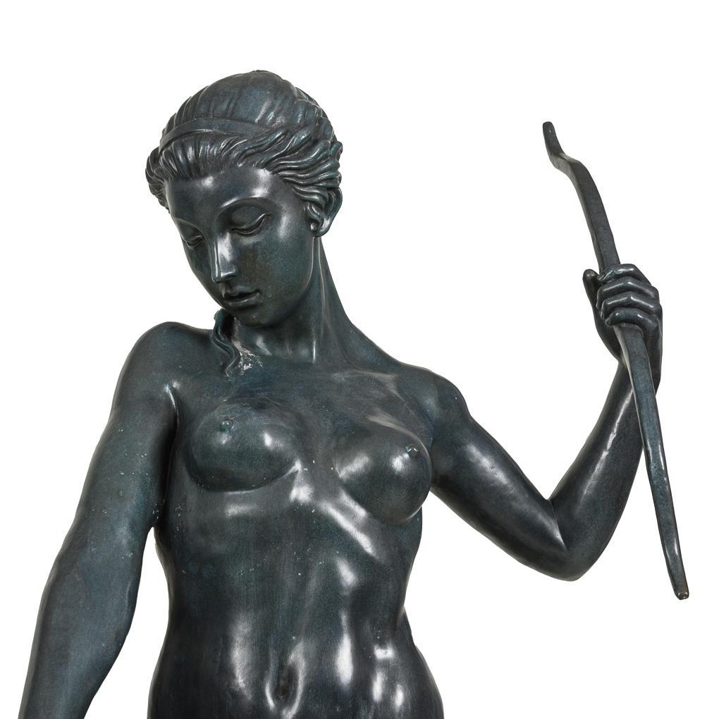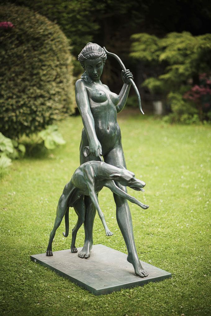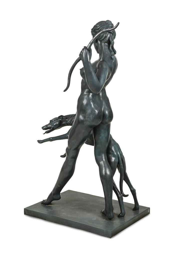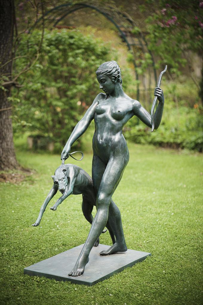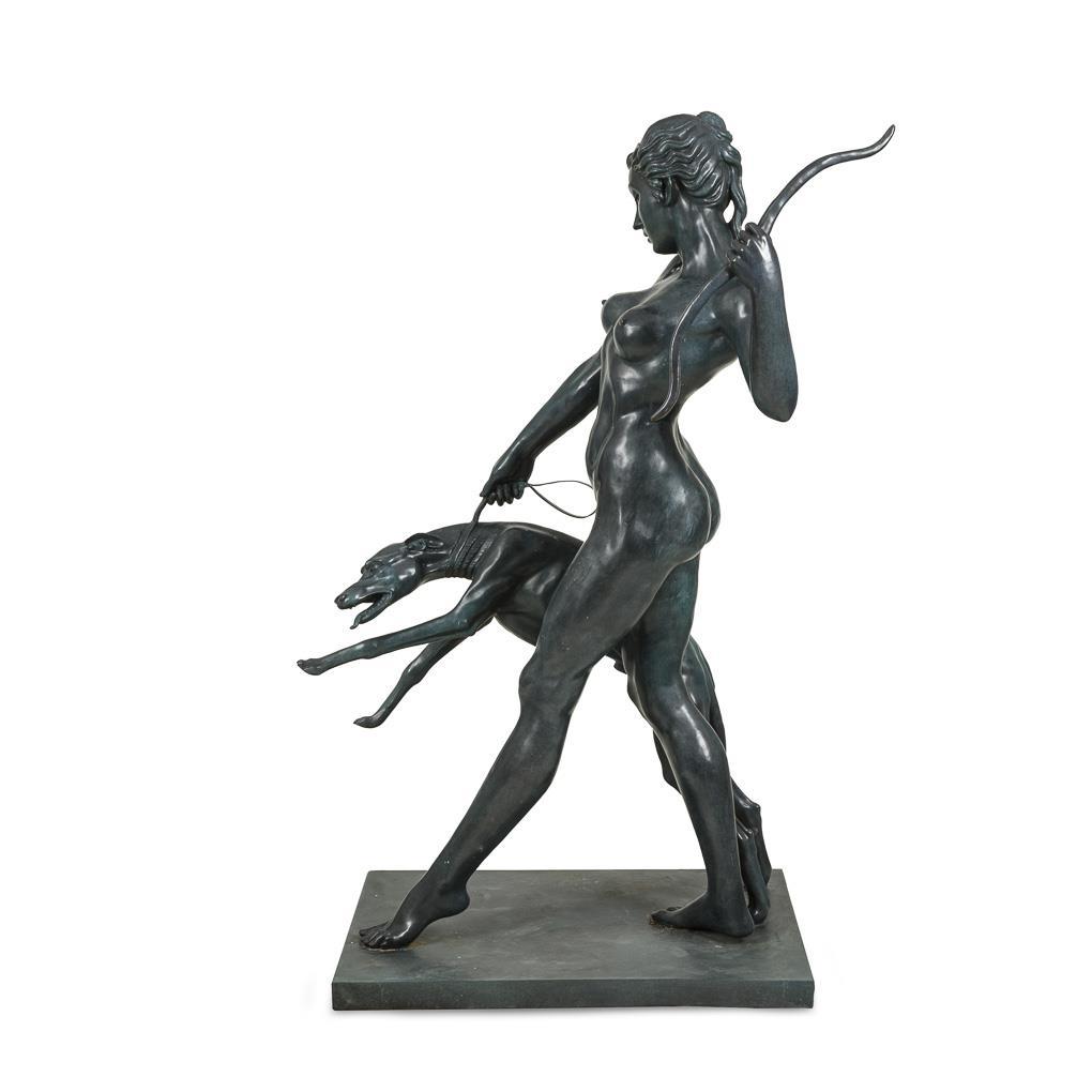 Almost life-size nude figure of the wide striding goddess, who holds her bow in a distinctive gesture, while the greyhound rushes forward on a leash. Modern casting after the 1923 original, which is now in the Metropolitan Museum New York.
