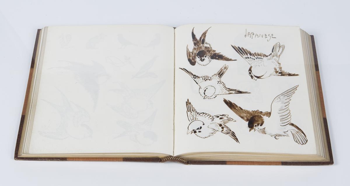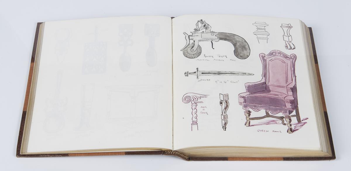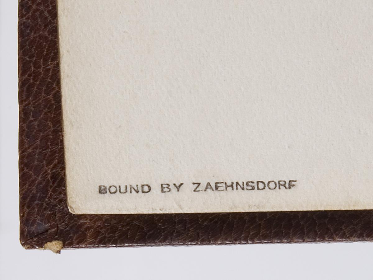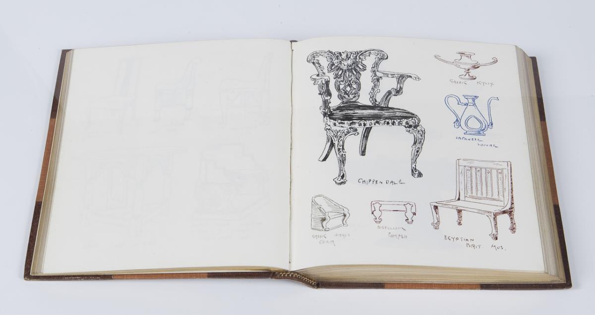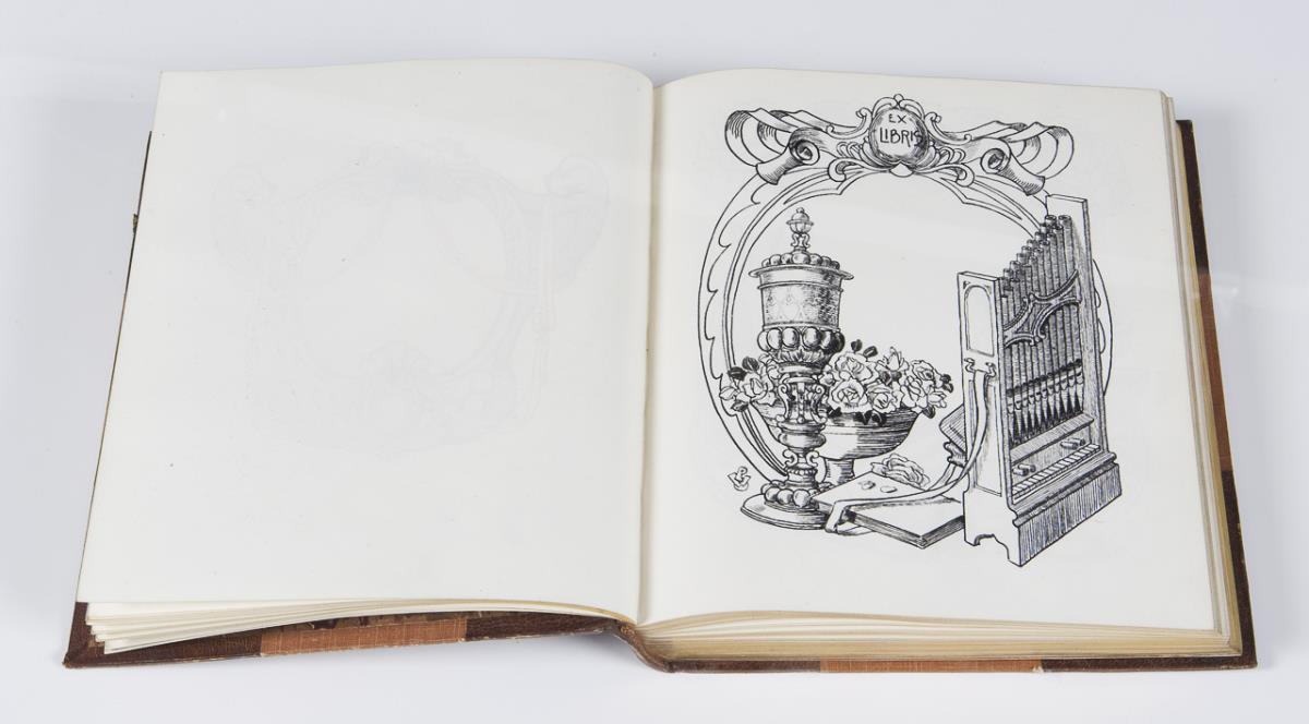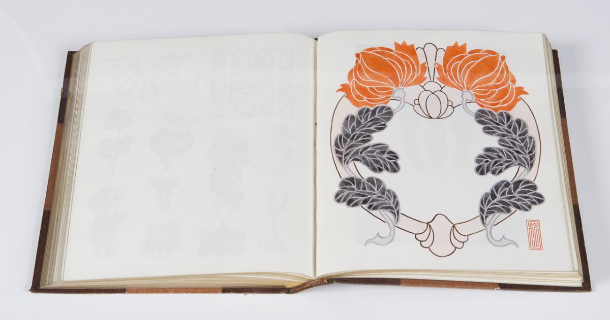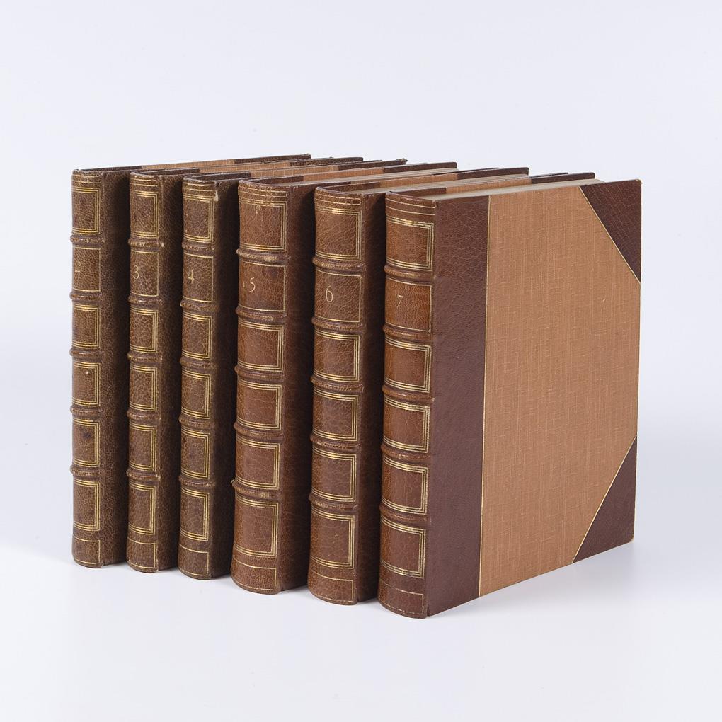 Numbered: Volume 2 to Volume 7. 796 painted pages several thousand pen and ink drawings and watercolor designs. Volumes 3, 4, 6, and 7 with art nouveau ornaments. In volume 2 and partly in volume 5 sketches for architecture, furniture, chandeliers, crowns, arms, iron grilles, railings, vessels, musical instruments, bookplates, flowers, leaves, and animals. All volumes with Pickford Waller bookplate and artist monogram at end, various single leaves monogrammed. Marbled endpapers, gilt edges all around, leather spine stamped in gilt. All volumes by the renowned London bookbinder Joseph William Zaehnsdorf, son of Josef Zaehnsdorf. Volume IV partially lightly foxed.