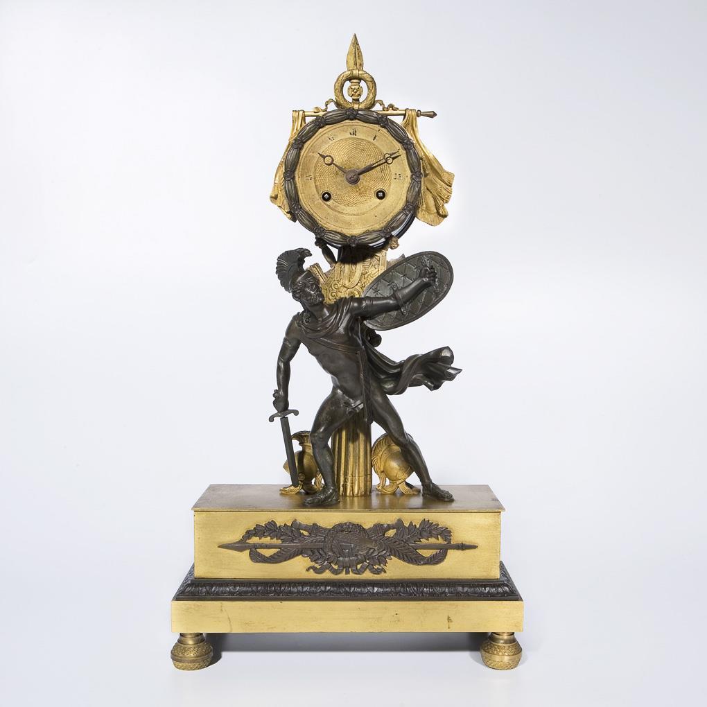 Base with ornamental molding and front applique on four adjustable feet. Fully sculpted Roman warrior in front of fluted full column with trophies. Crowning with drapery and laurel wreath. Centered guilloché dial, pendulum on thread suspension, striking movement on bell, key winding. Numbers and signature rubbed, thread to pendulum suspension torn, function could not be tested.