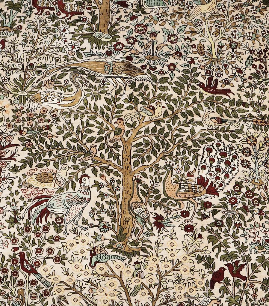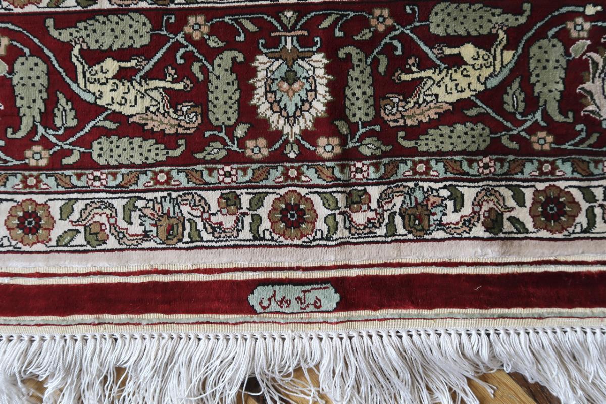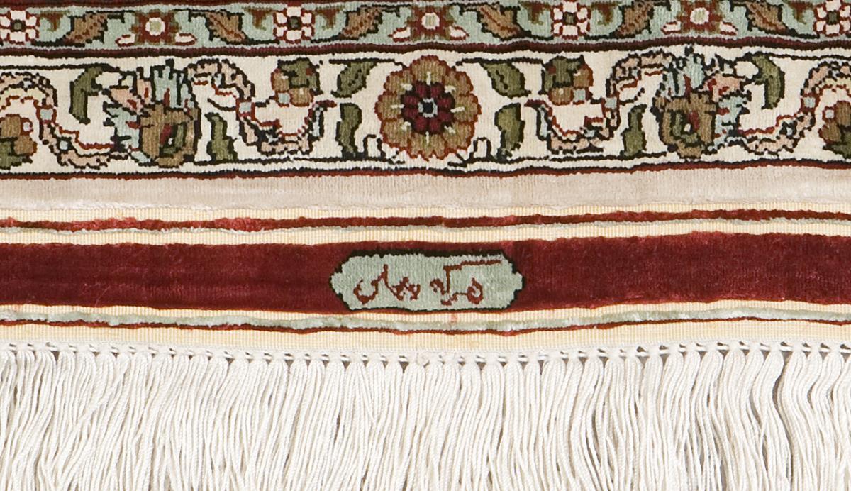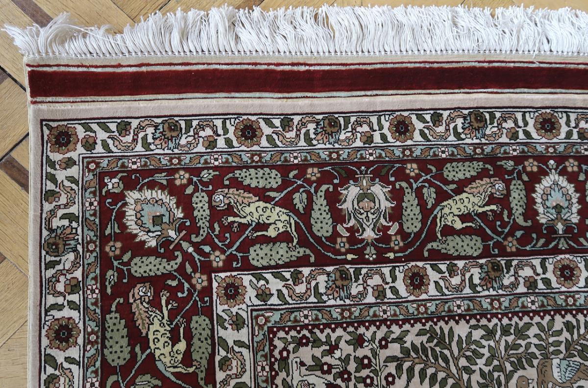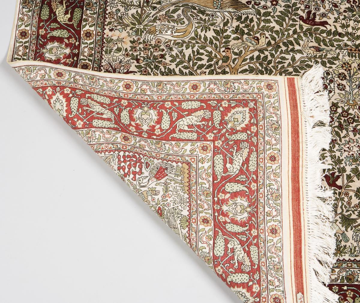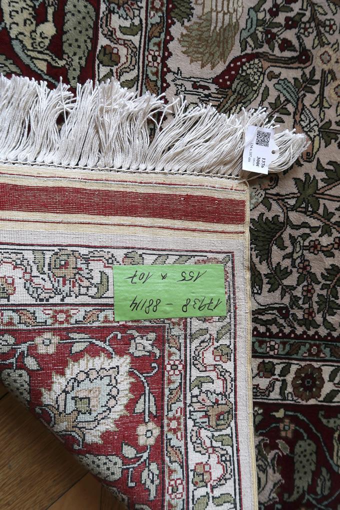 Hand-knotted carpet, attributed to Uzbek production. Signed: "Mely-Hereke", lush paradise garden motif in the inner field. Approximately one million knots per square meter. Very good condition.