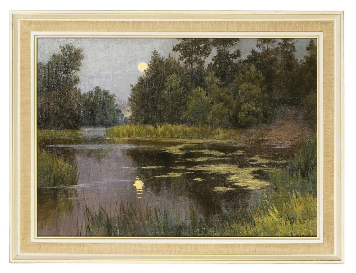 Romantic landscape detail with atmospheric effect. A thoughtfully composed and stillness conveying painting. Profiled frame with fabric passepartout.