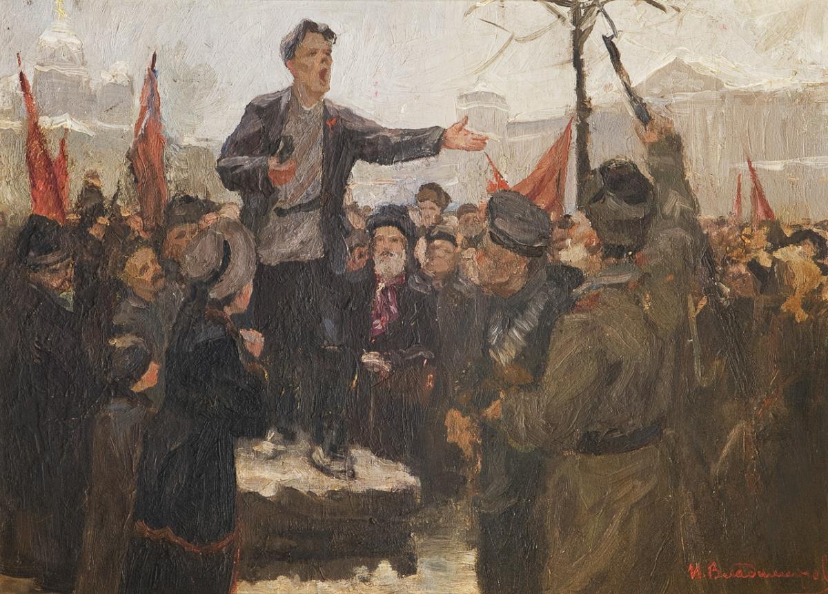 A political genre scene. Whether the speaker succeeds in steering the view of the assembled crowd in the desired direction remains open. Profiled frame.