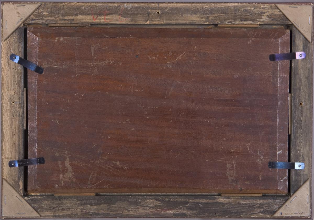 Small-format view with figure staffage in virtuoso fine painting. As good as new gold frame.