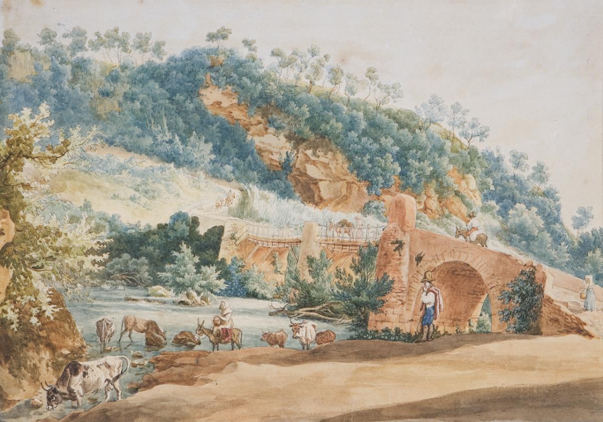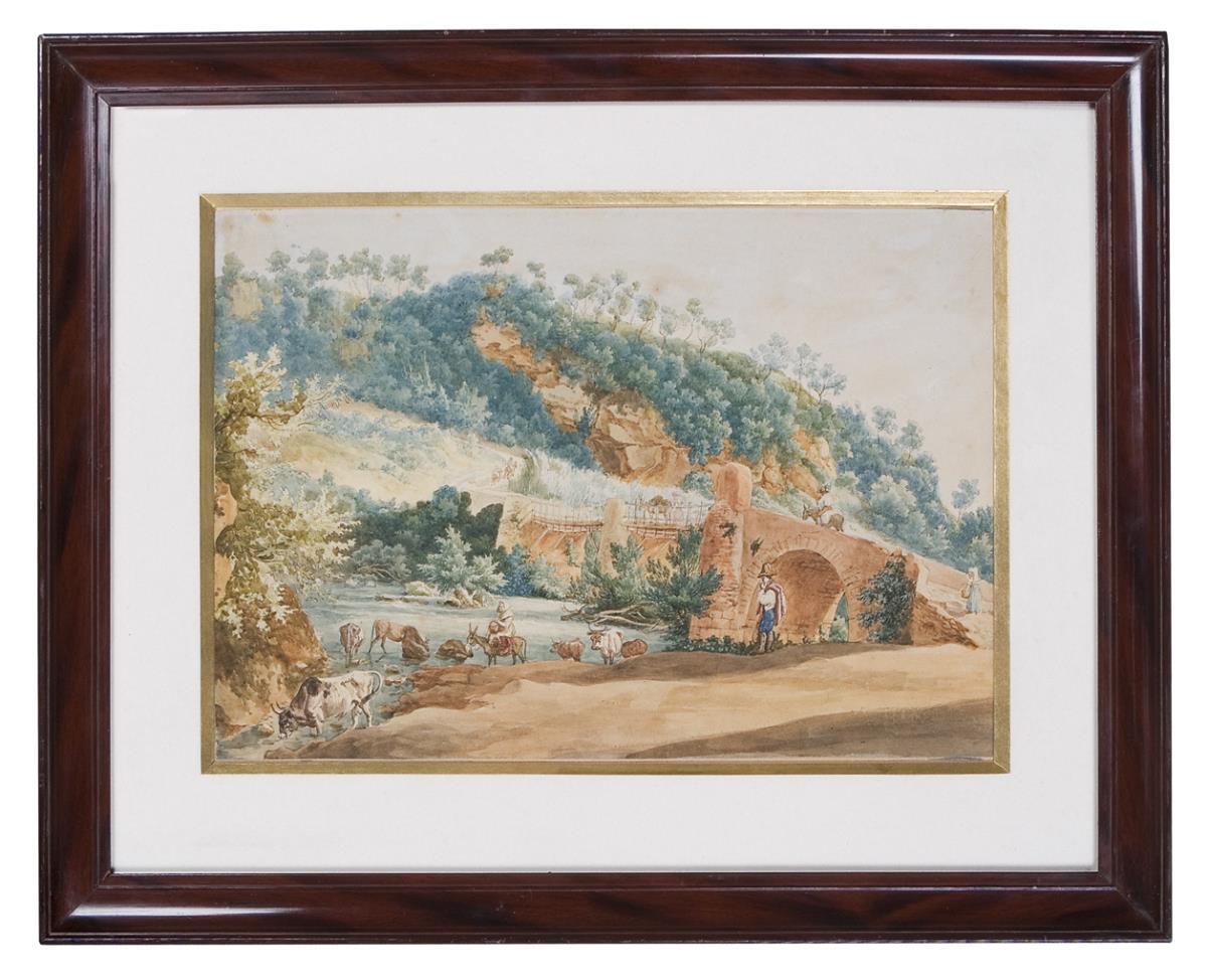 The landscape is spread out in small parts before the viewer, the numerous figures in their busyness play rather a minor role. Passepartout, glazed profile frame. Am upper corner slightly foxed.