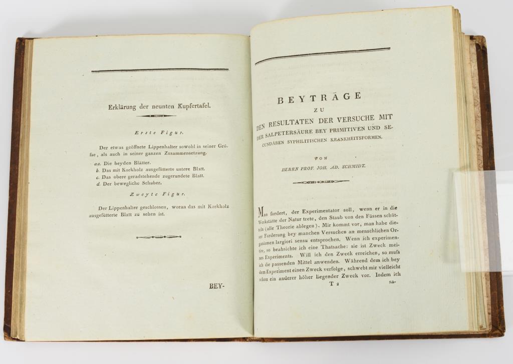Ganzledereinband, im Vorsatz alter Rapportzettel eingeklebt. Besitzvermerk. 189 Seiten und 9 Tafeln. Fallbeobachtungen zu Veitstanz, Syphilis, Brustkrankheiten u.a. Altersgemäß sehr guter Zustand.