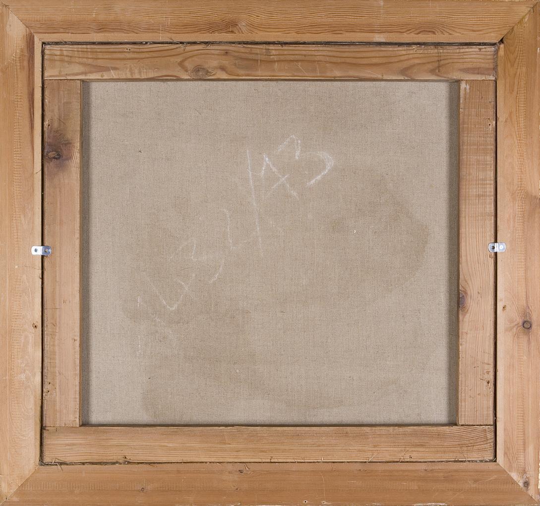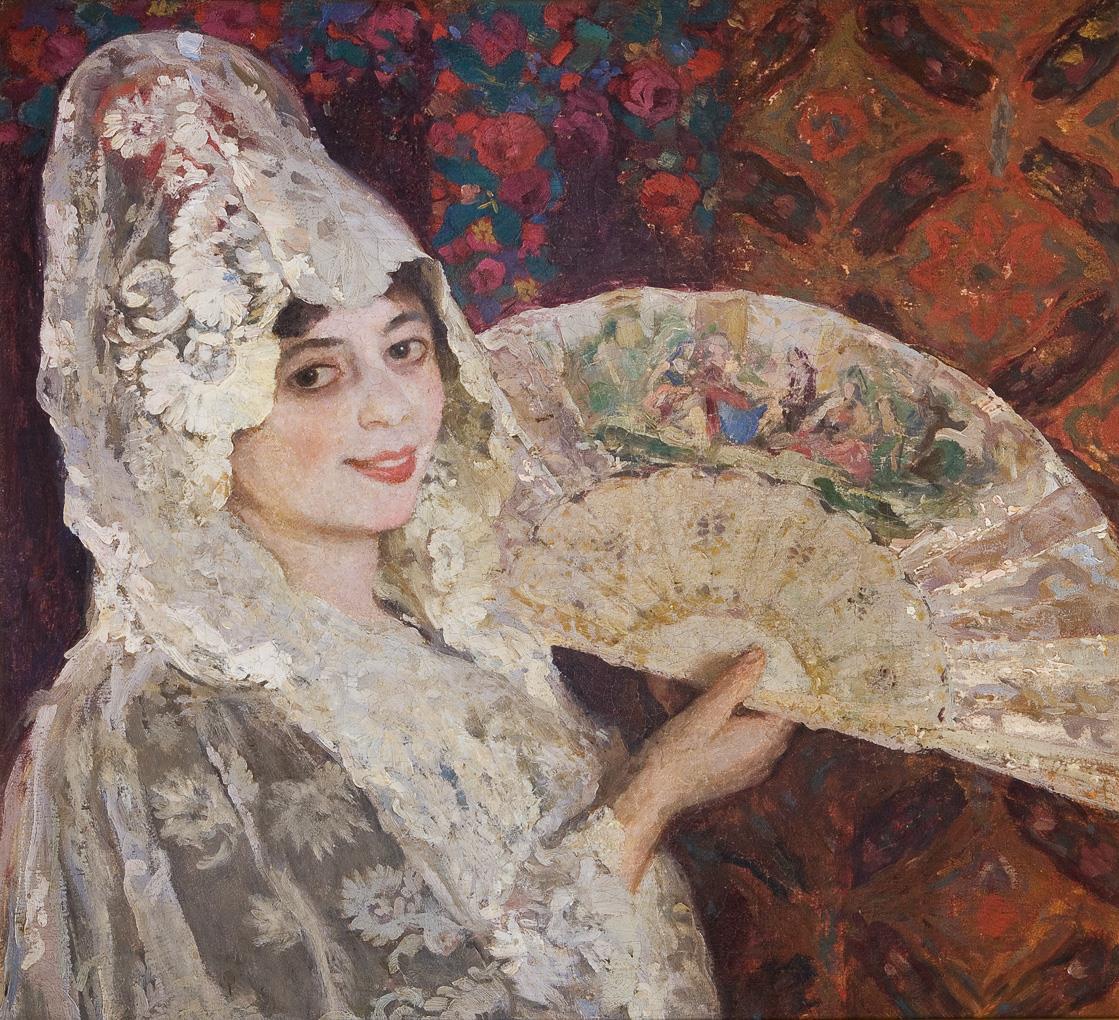 Monumental and area-filling is the young beauty with her folding fan before a floral colorful patterned background in an expressive representation reproduced. Profiled gold frame.