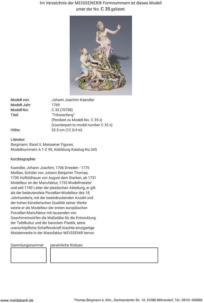 Kaendler, court sculptor and modeller. Since 1731 at the manufactory. From 1749 head of the sculptural department. An ingenious creator of the European porcelain figure. Meissen manufactory price: 15.000,- Euro * Partner auction Bergmann.